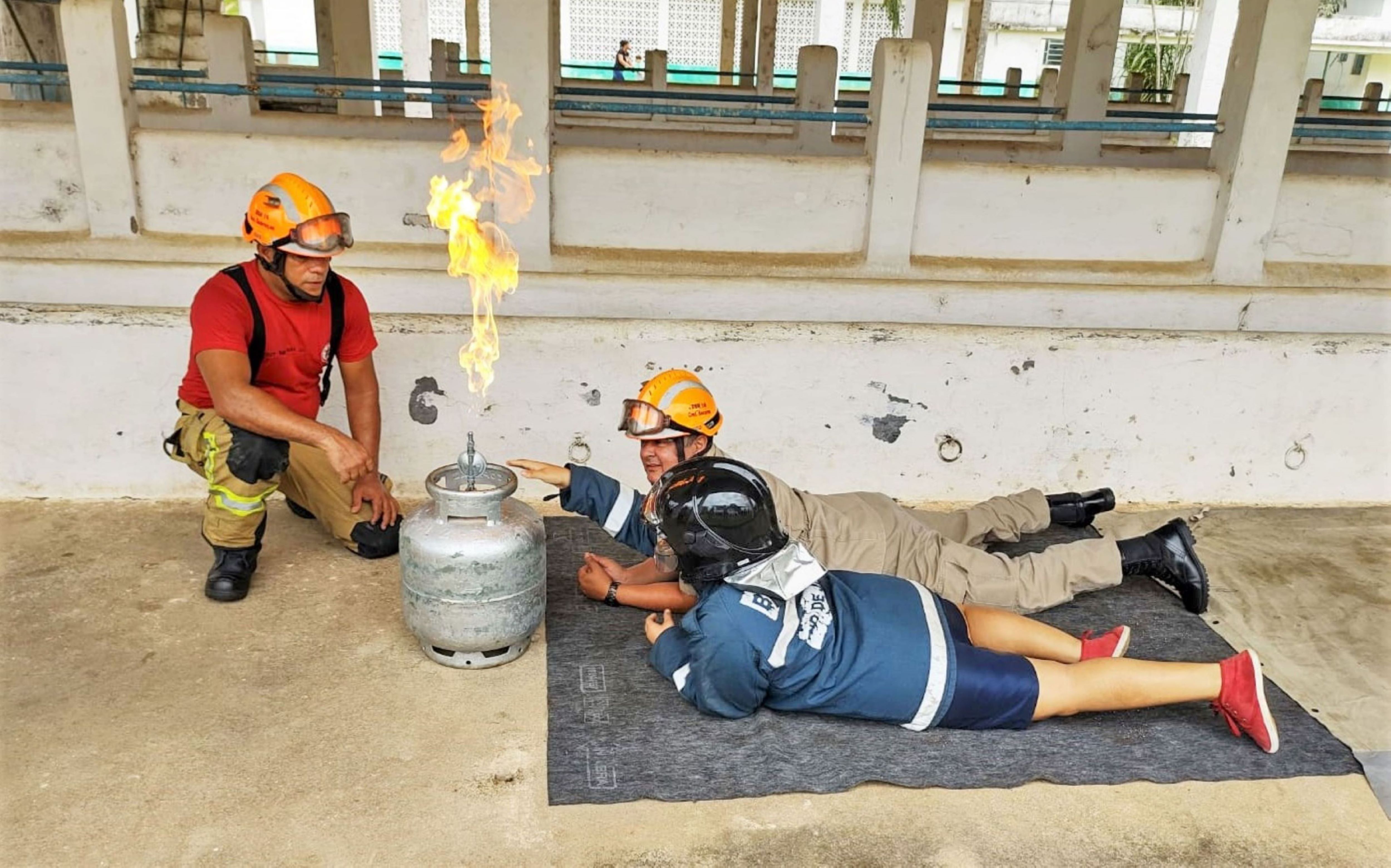 Sempre seguros pela presença do profissional militar e dos equipamentos de proteção, os agentes participam de um simulado de combate a incêndio