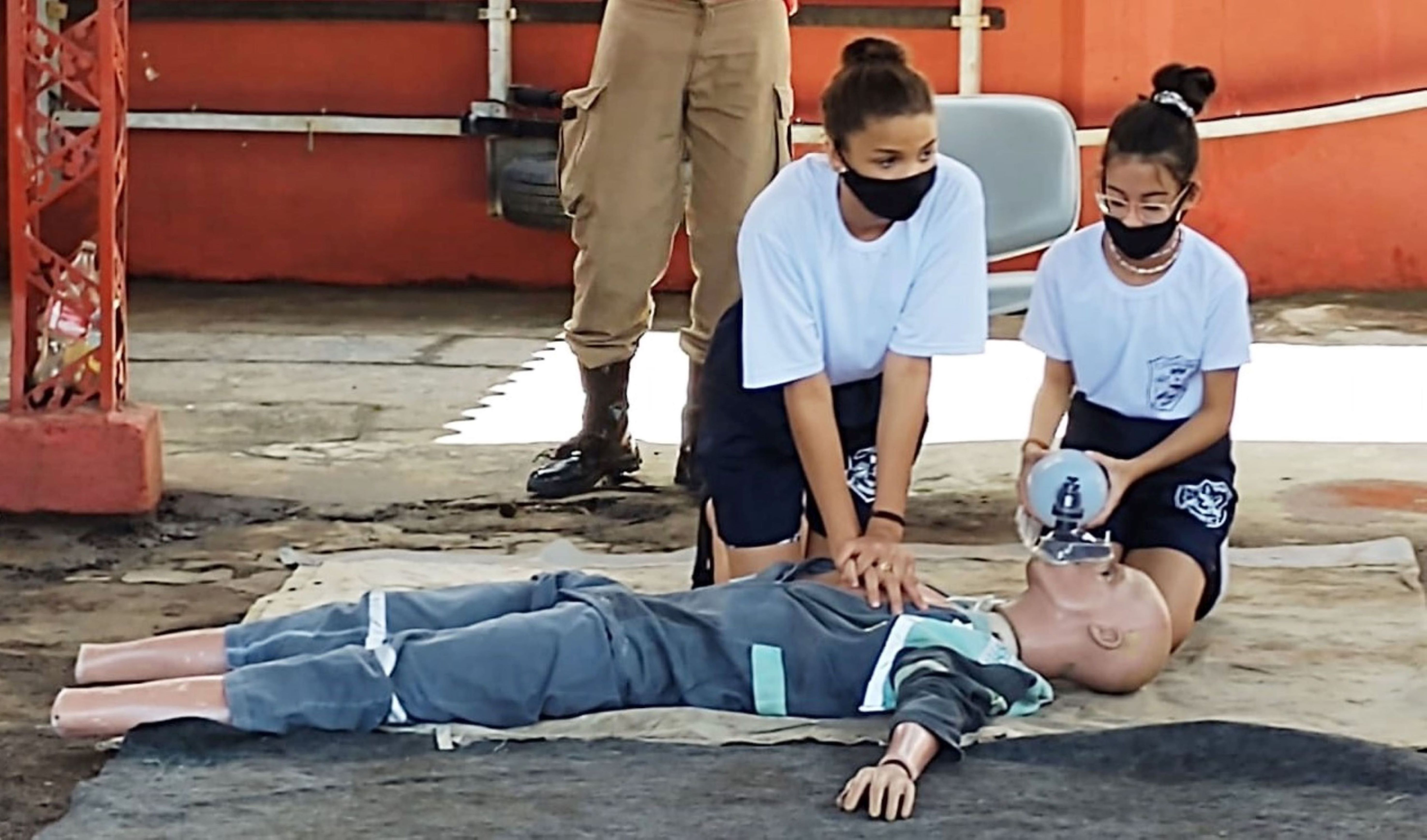 Com um boneco específico, as meninas do projeto puderam simular ações de ressuscitação cardíaca e respiração artificial