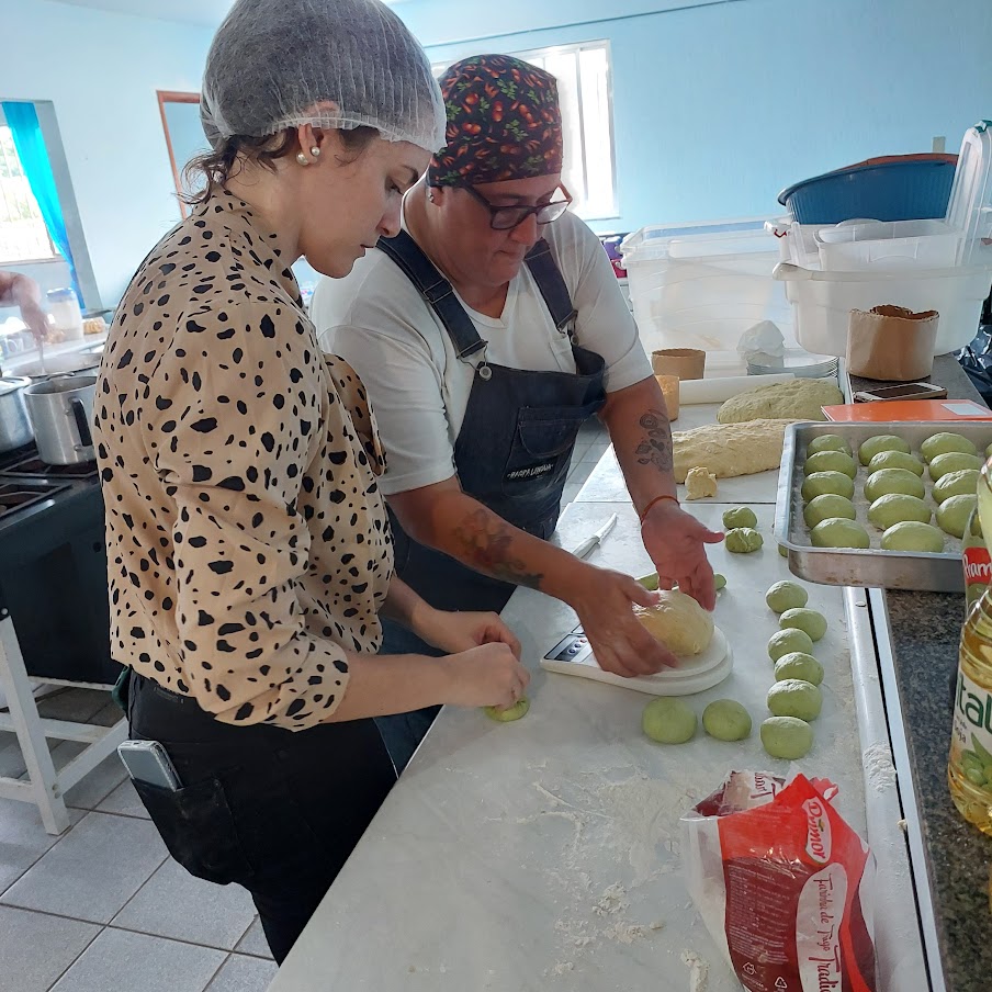 Literalmente colocando a mão na massa, as profissionais desenvolvendo os pães que seriam saboreados pelas crianças da Creche Municipal