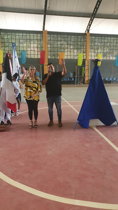 Parceiros na realização das Olimpíadas Estudantis, secretária de Educação Claudia Vogas e de Esporte e Lazer Hugo Carvalho juntos na abertura da festa
