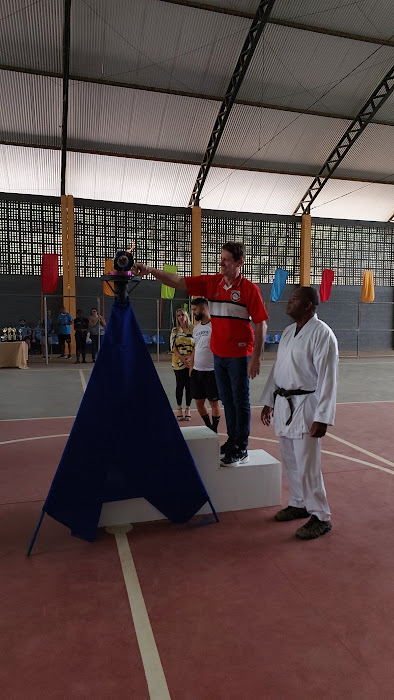 Ao lado do atleta das artes marciais, o ex-jogador de futebol Wildimar Faria dá início ao sonho local acendendo a pira olímpica