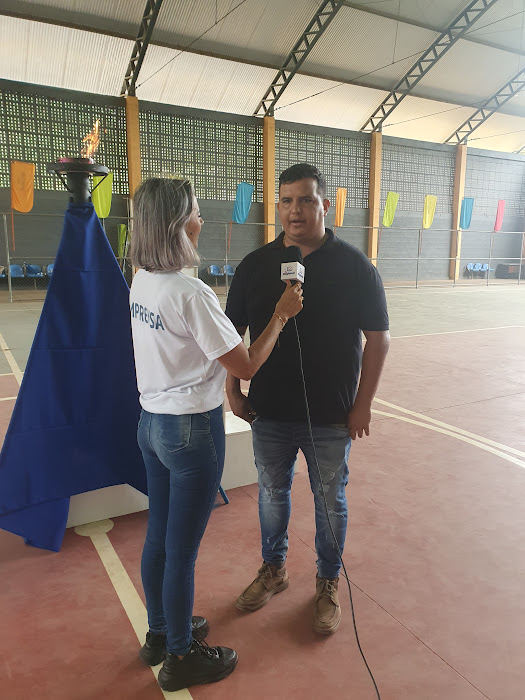 Secretário de Esporte e Lazer Hugo Carvalho concedendo entrevista à jornalista Michele Ribeiro, da TV Regional