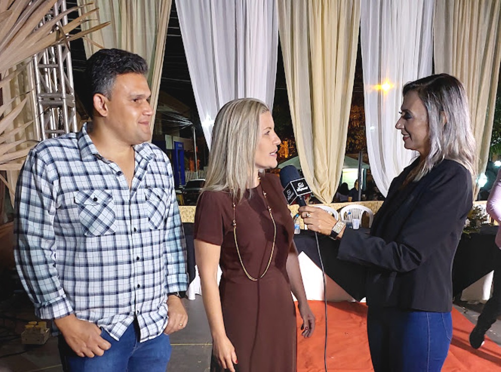 Prefeita Michelle Bianchini e secretário de Governo João Vitor Pontes no momento em que concediam entrevista a Michelly Ribeiro, da TV Regional