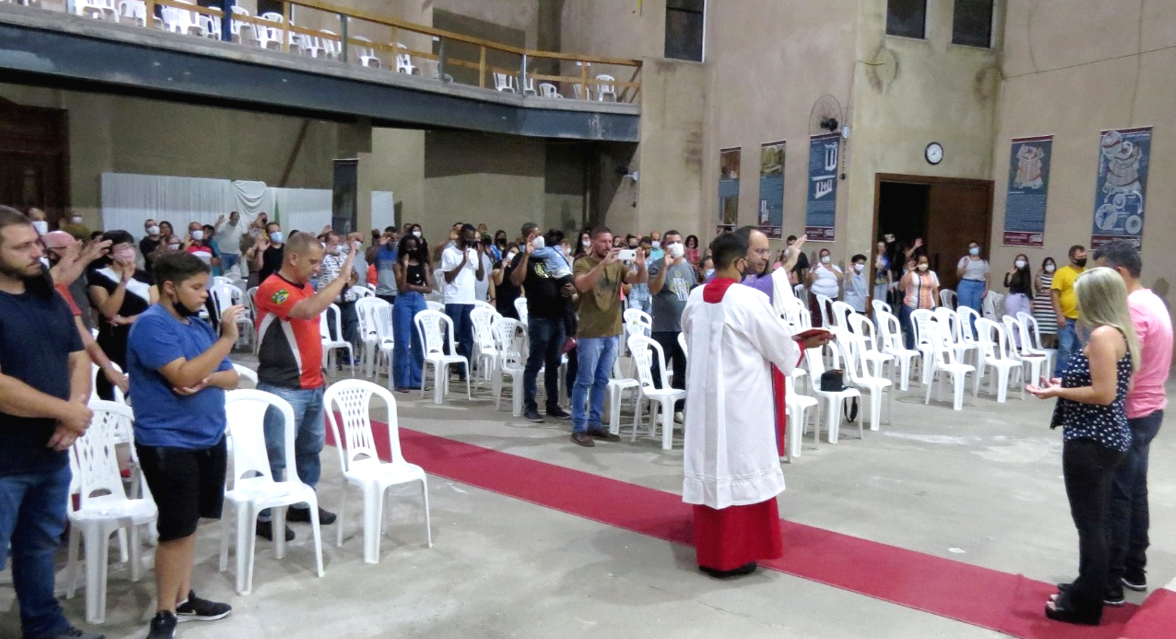 Michelle e João Vitor participando juntos da missa na Paróquia de São João Batista, padroeiro do município de Macuco