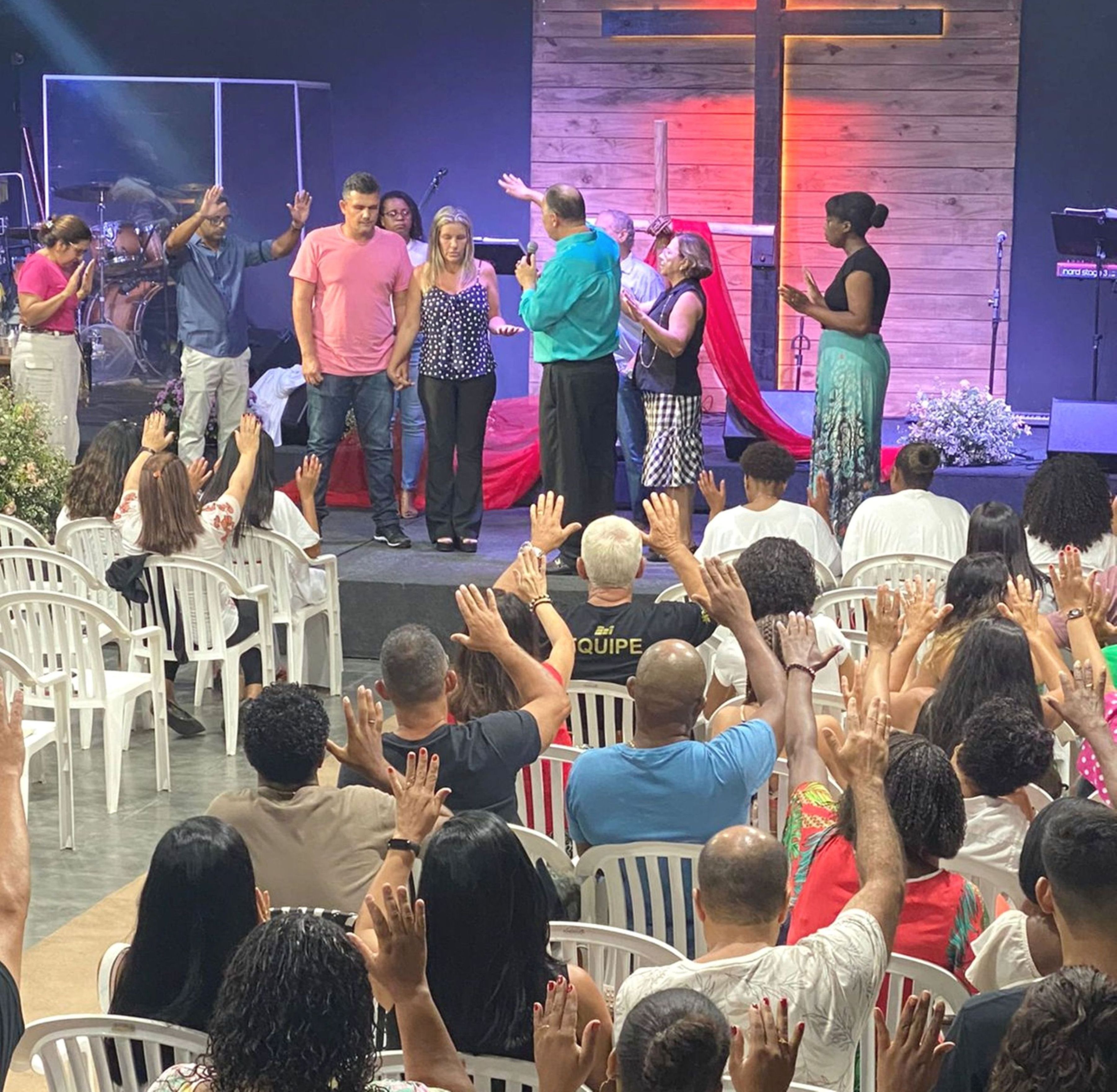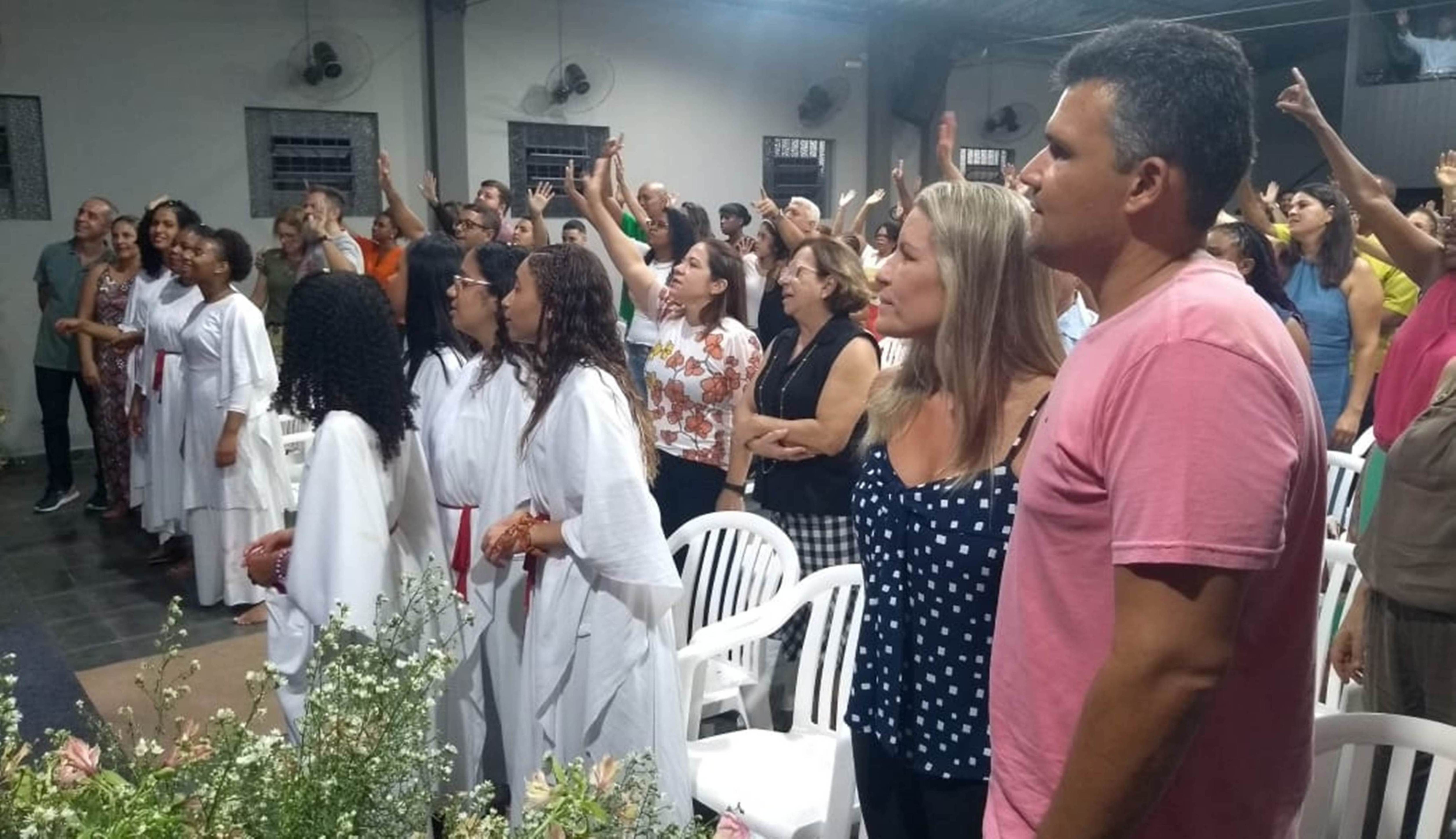 Durante o culto na sede da Comunidade Maranata, a nova prefeita e o esposo foram saudados com orações e manifestações de afeto