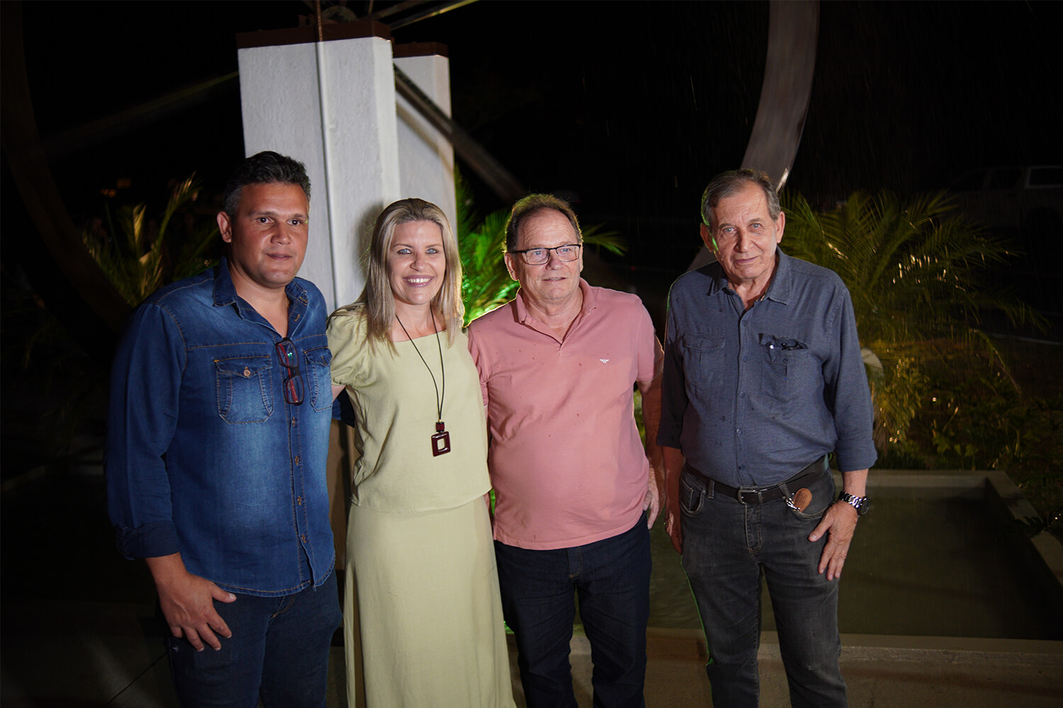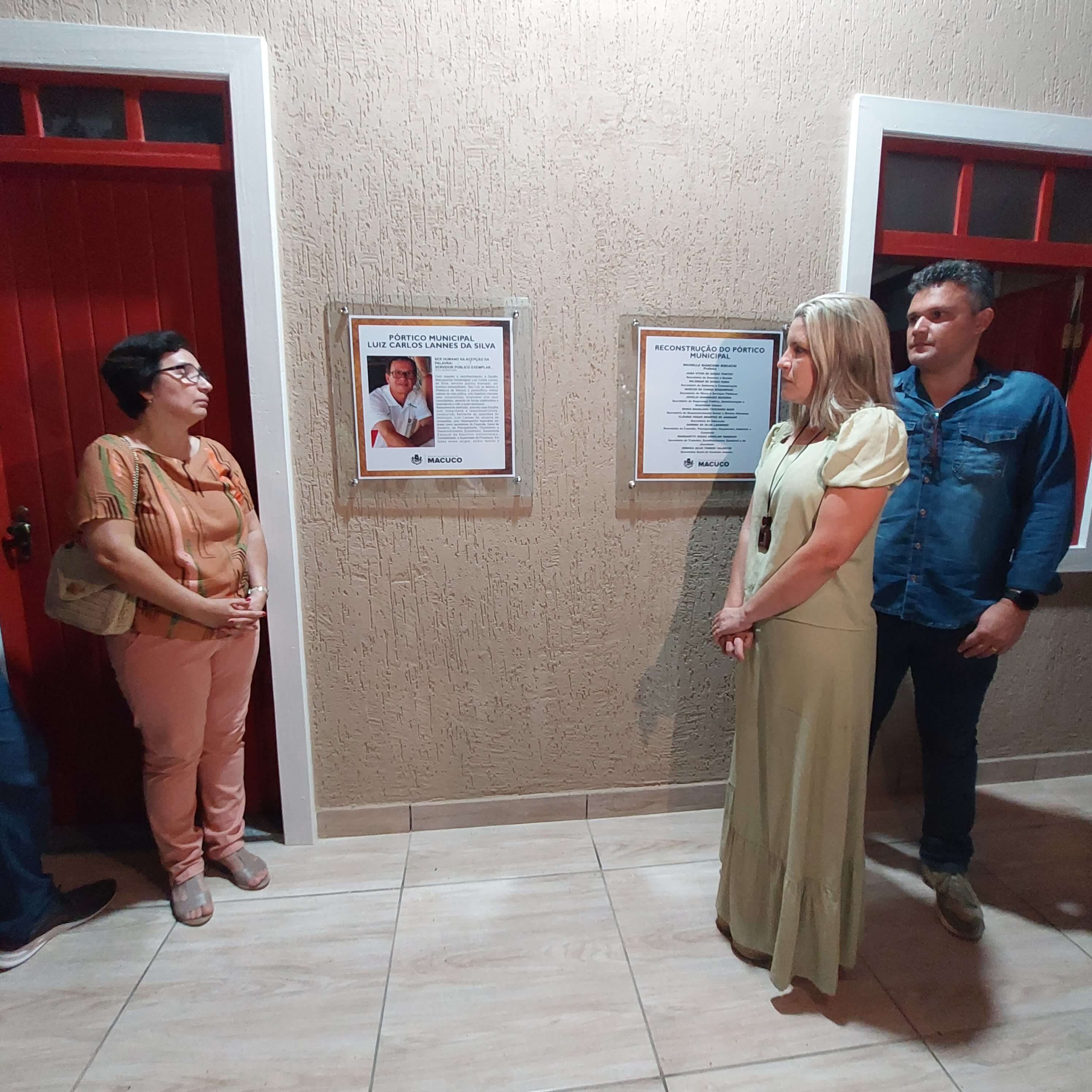 Ao lado de Solange de Carvalho, esposa do homenageado Luiz Lannes, prefeita Michelle Bianchini e secretário João Vitor acompanham a leitura da placa