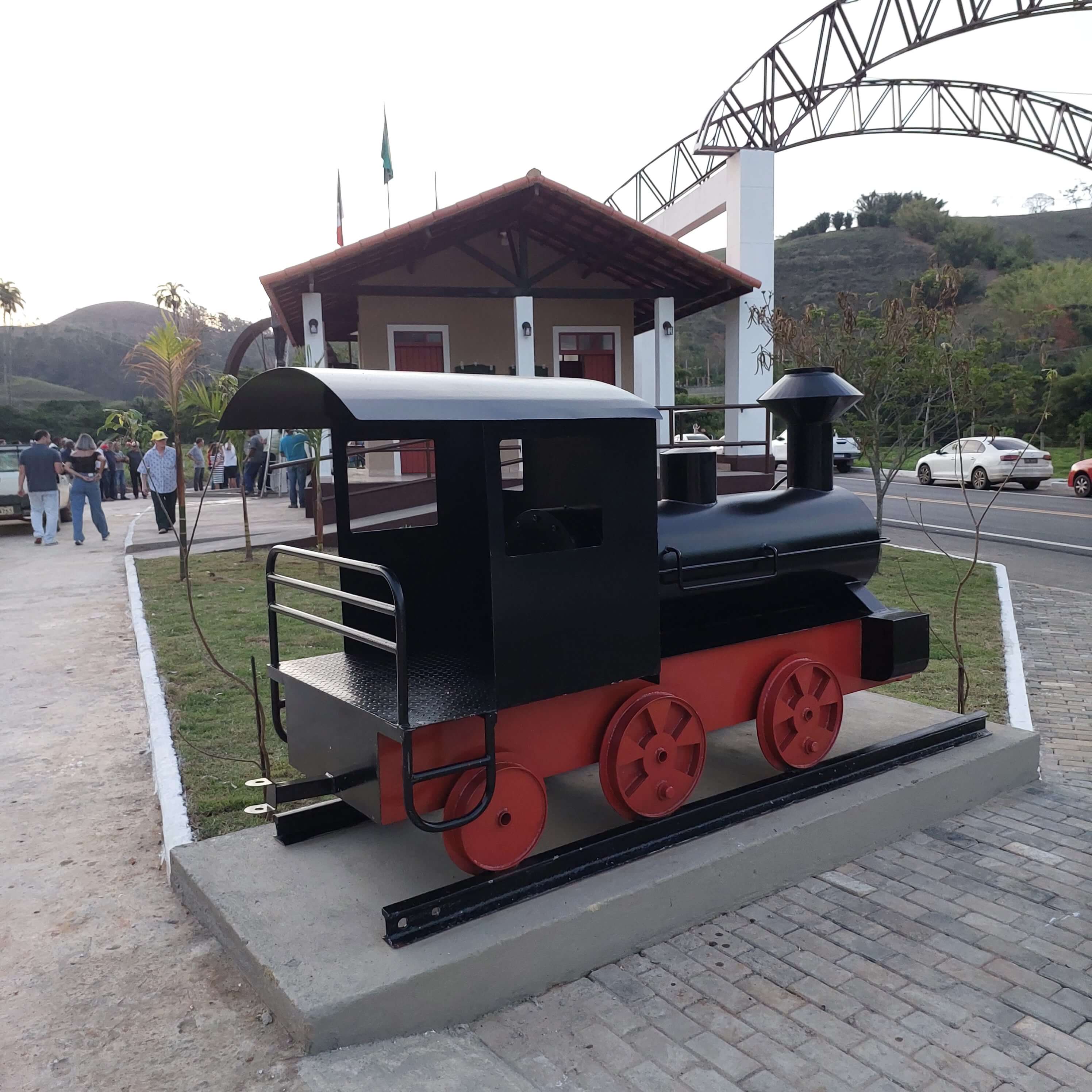 Uma réplica da extinta ‘Maria Fumaça’, o trem que fez parte da história do município, também integra a nova paisagem do Pórtico de Macuco
