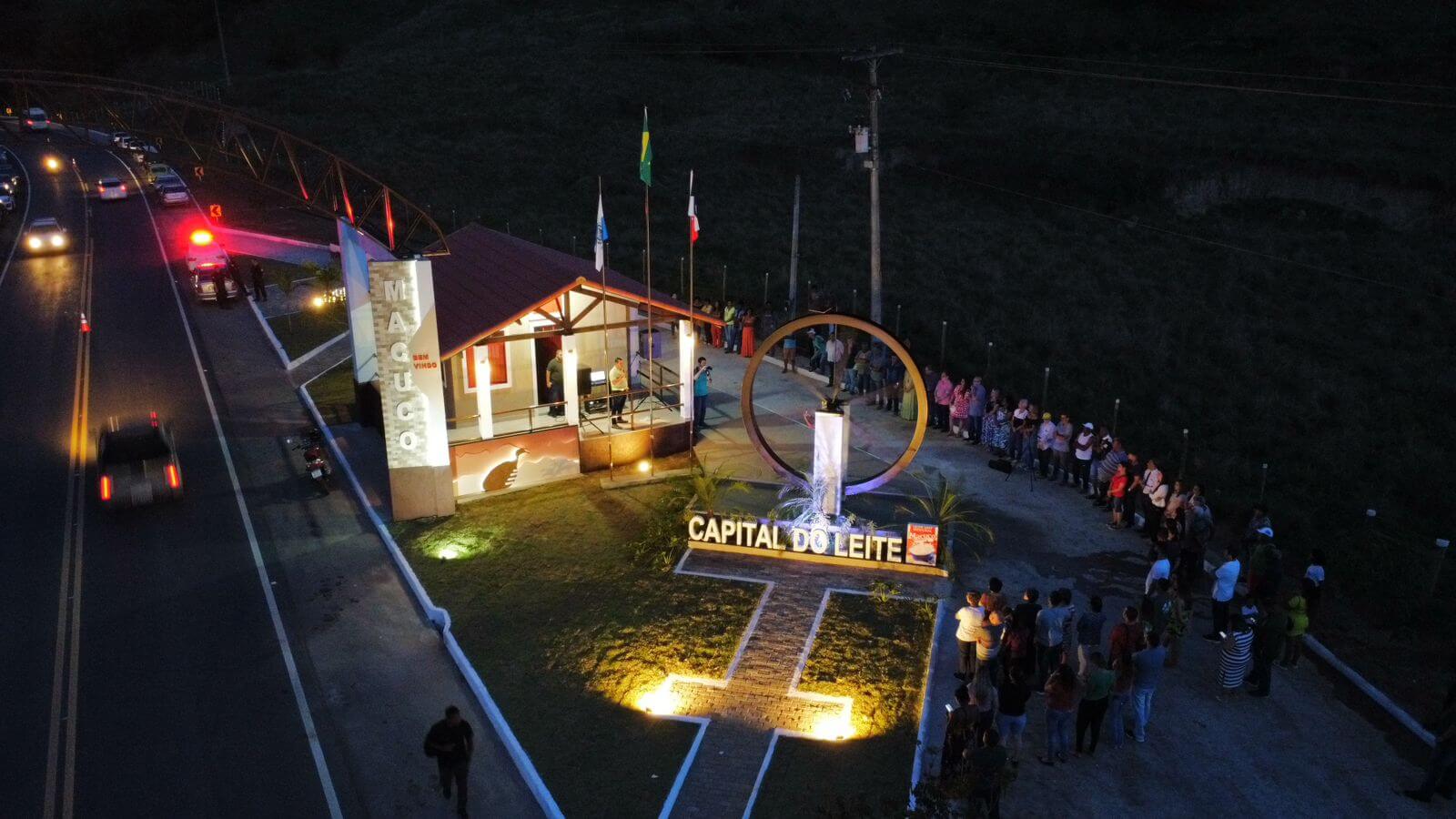 Bela imagem feita de um drone dos momentos que marcaram a entrega do Pórtico de Macuco reformado e com nova roupagem