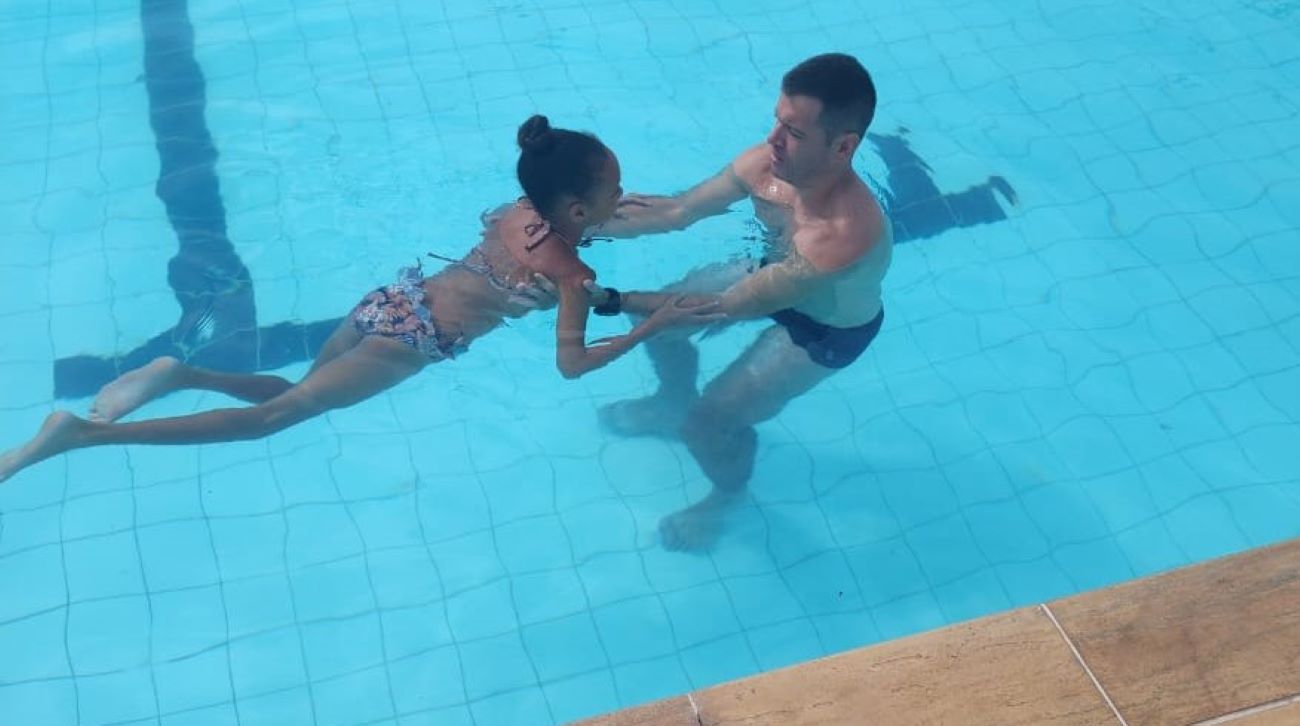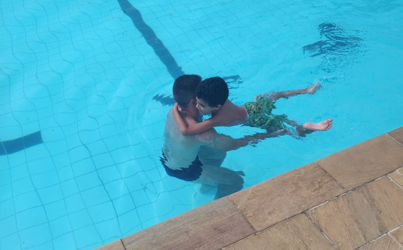Professor Ayala em ação na piscina semiolímpica com um dos meninos inscritos no Projeto de Natação de Macuco