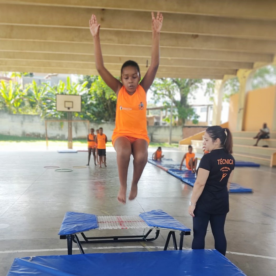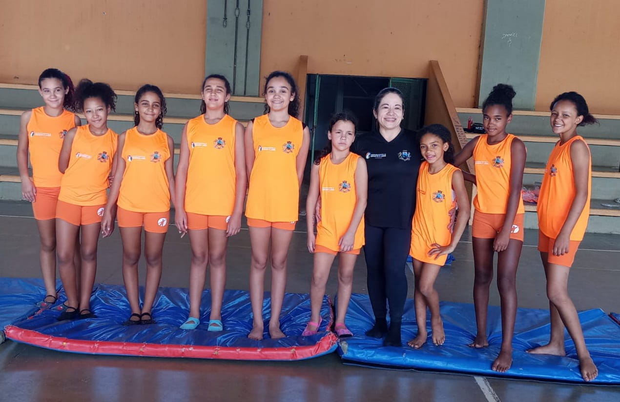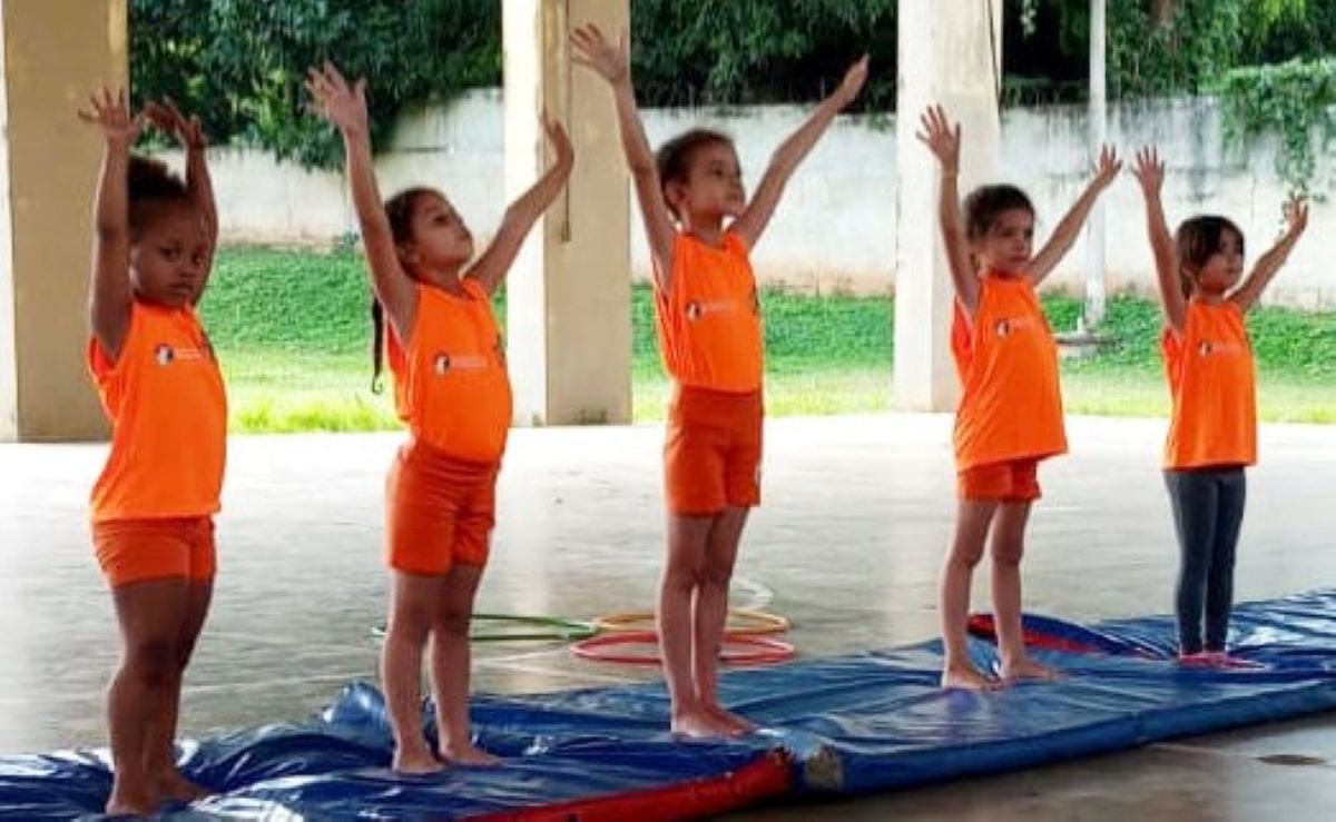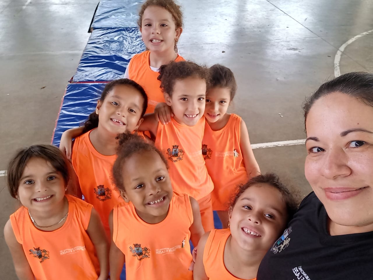 As pequenas atletas da ginástica artística olímpica iniciando seus treinamentos na quadra do CIEP Municipalizado Honório Peçanha