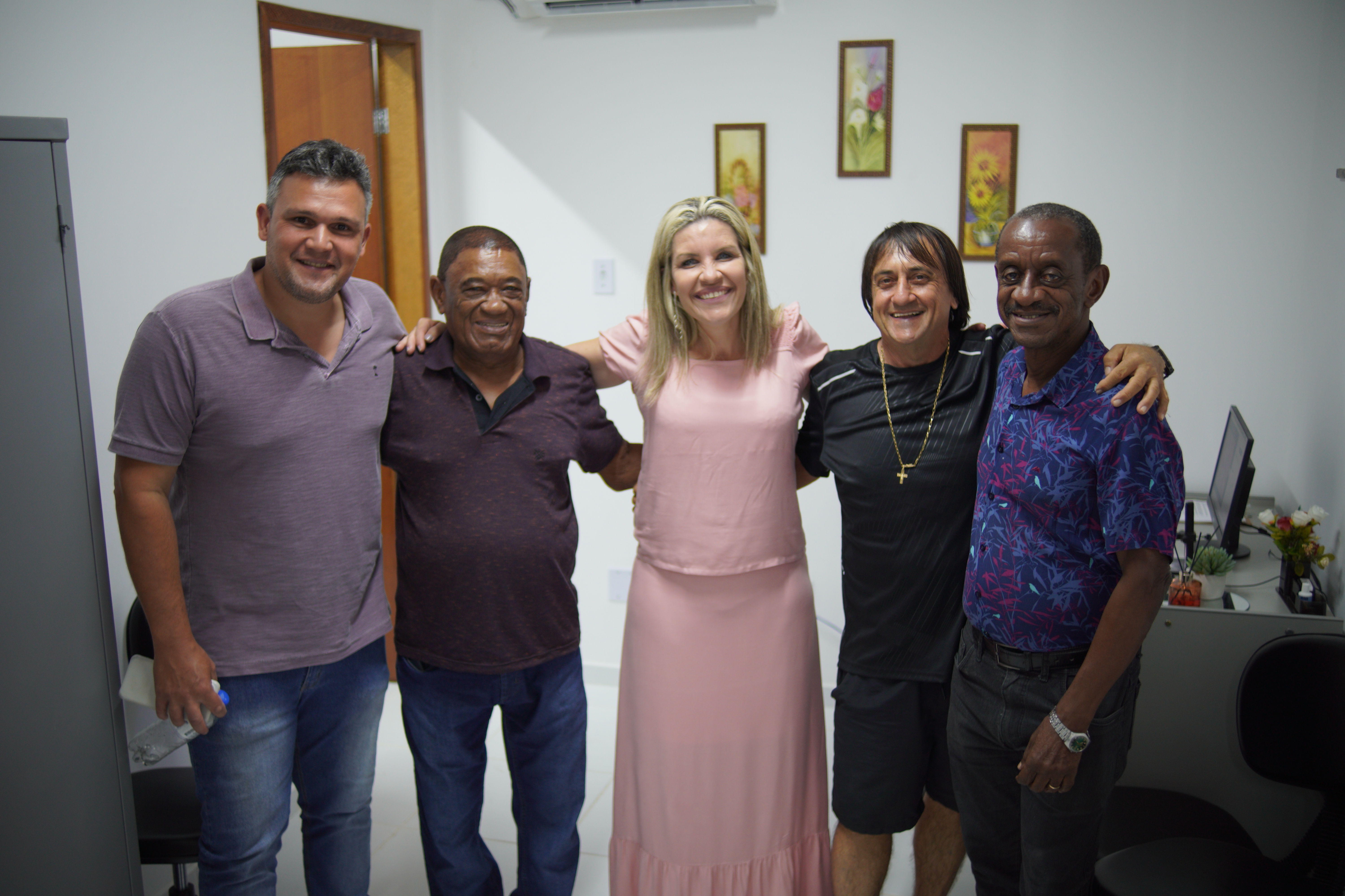 Prefeita Michelle Bianchini e secretário de Governo João Vitor Pontes com os ex-vereadores Joãozinho Carvalho, César do Taxi e Nilo Cruz durante o evento