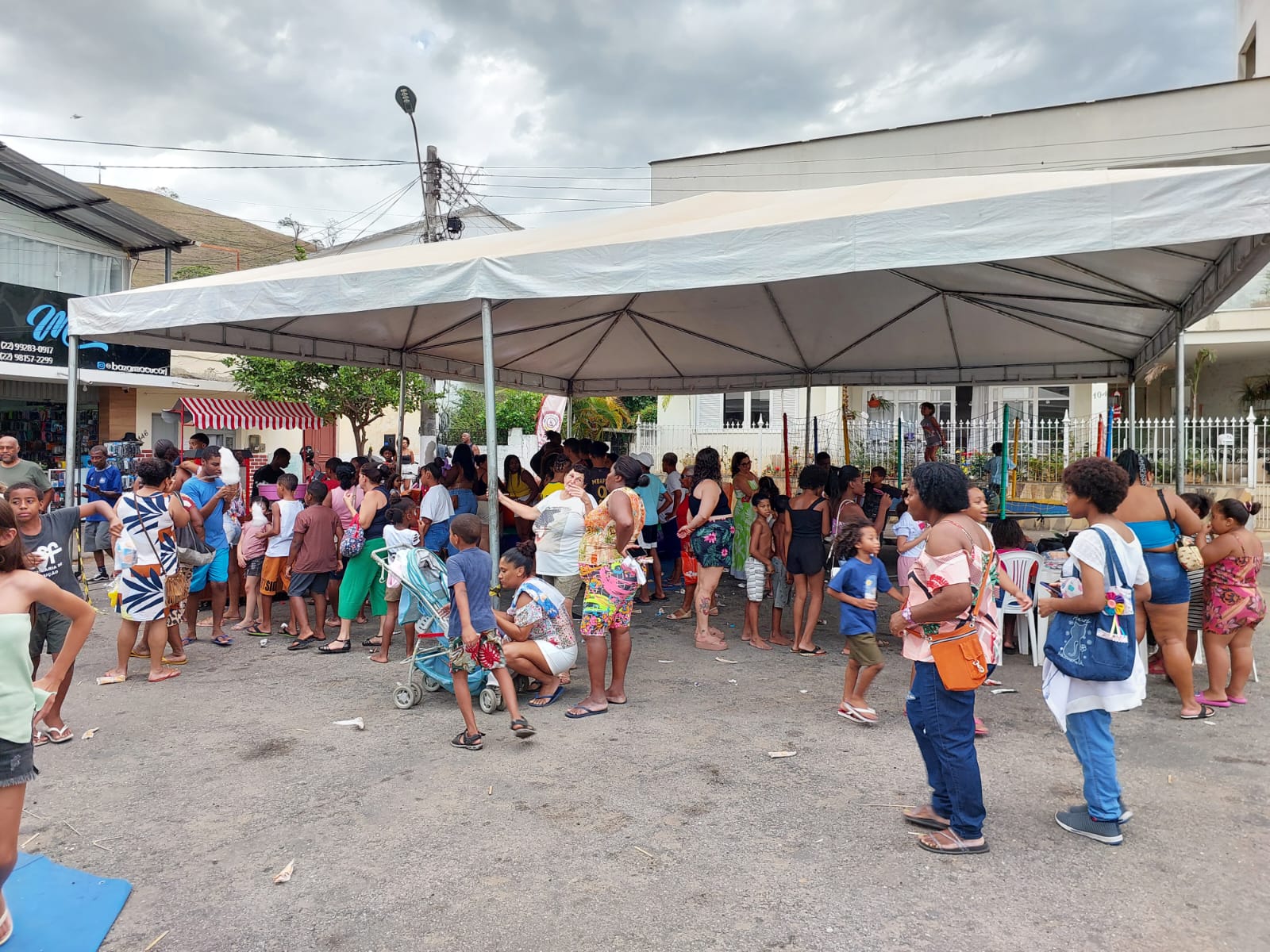 Uma tenda gigante foi disposta no centro da cidade para abrigar as brincadeiras e atividades com as crianças, enquanto os pais se recadastravam no coreto da praça