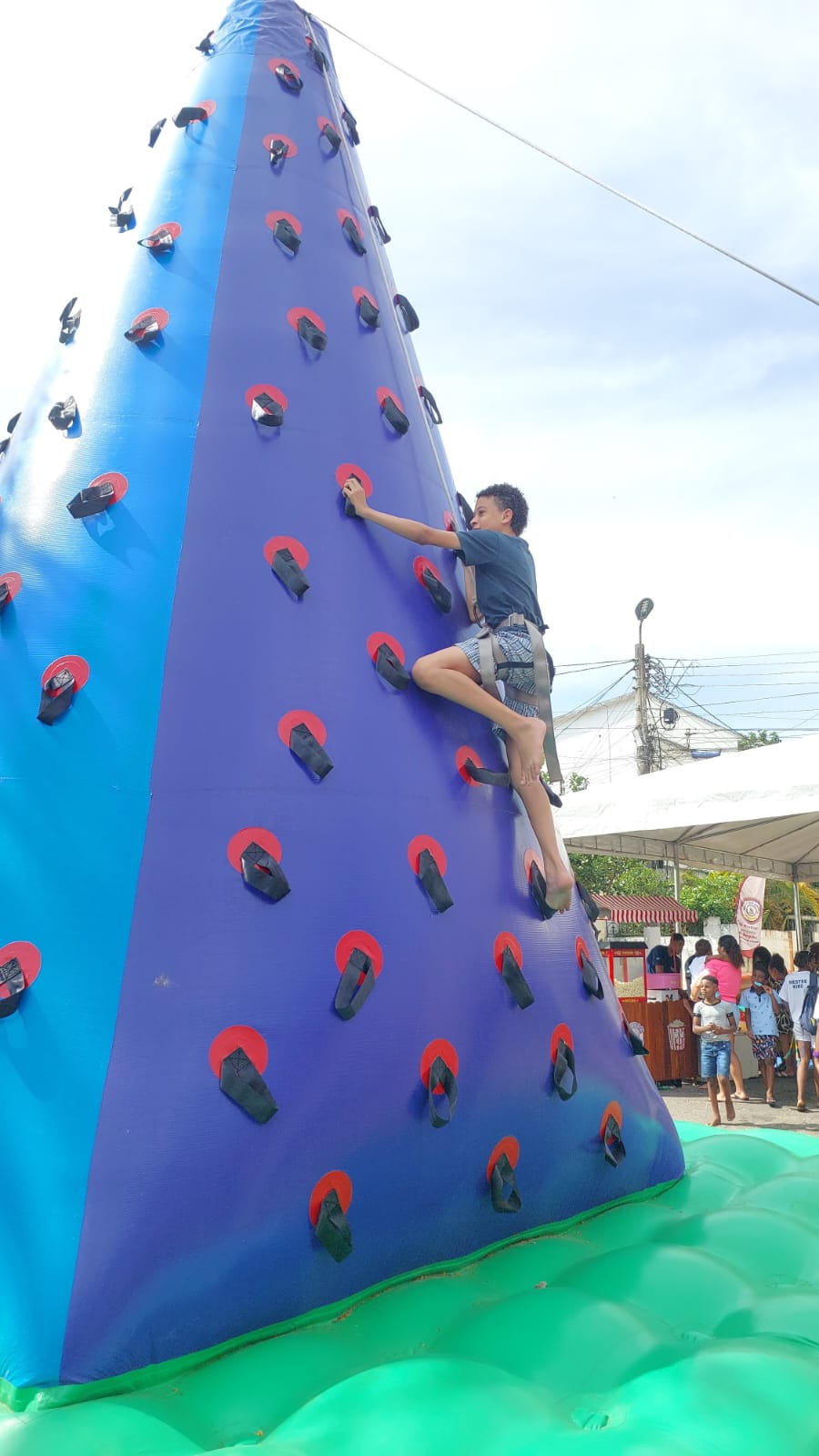 Menino brincando de escalada em segurança deixando claro que o evento também foi para garantir o fortalecimento de vínculos