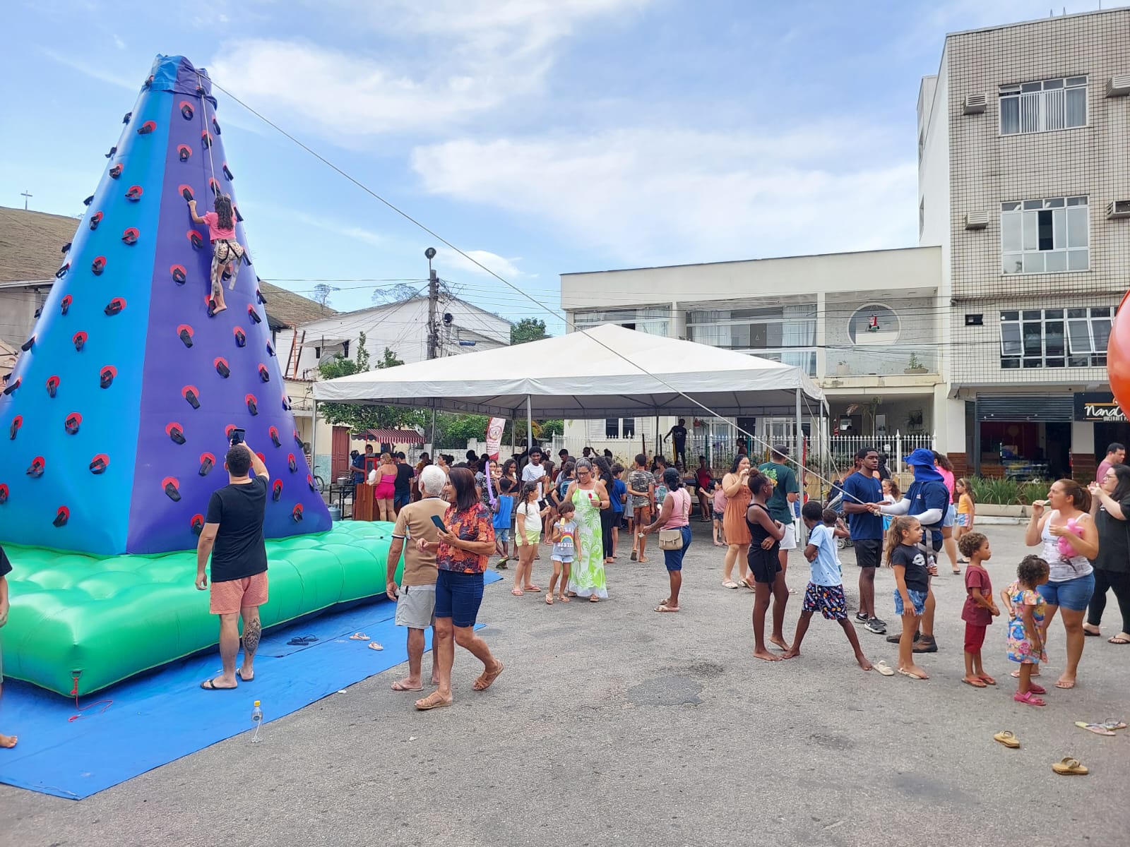 O escorrega atraiu um número expressivo de crianças, que subiam e desciam freneticamente durante o sábado festivo
