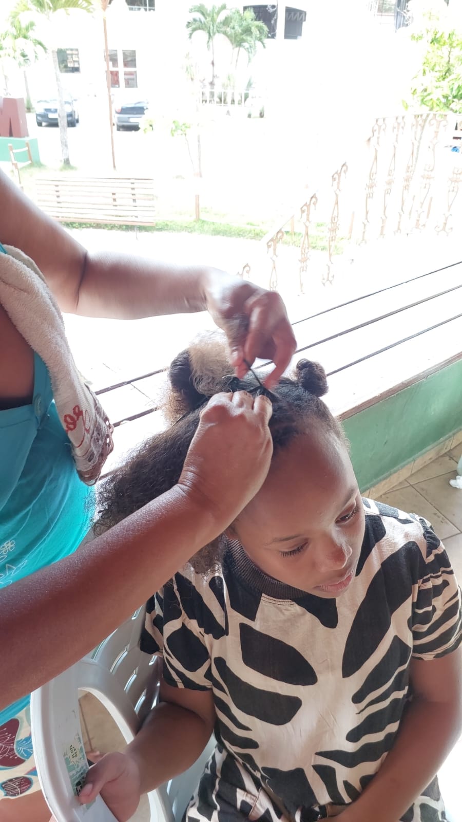 Mais uma arte afro sendo exibida com grandeza través do trabalho qualificado da trancista fazendo a cabeça de uma das meninas
