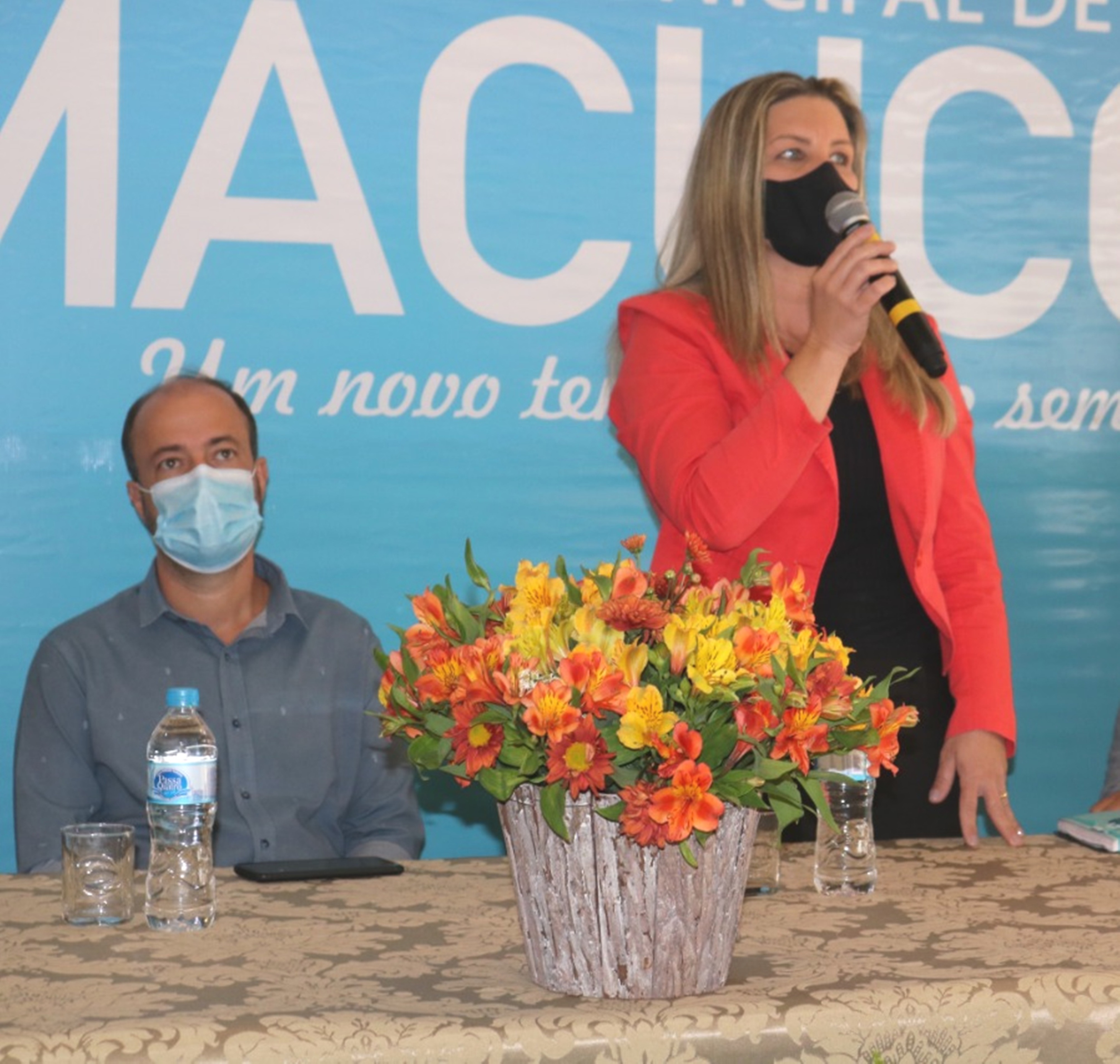 Palestrante recebe do prefeito e secretária embalagem de produtos Macuco