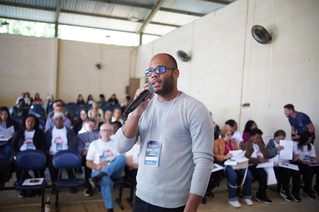 O mestre de cerimônias Marcelo Borges conduzindo o evento marcado pela aprovação do Plano Plurianual e eleição do Conselho Municipal de Saúde