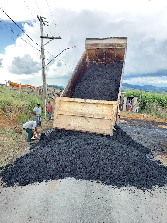 Caminhão da Prefeitura de Macuco despejando a massa asfáltica a ser utilizada para garantir o asfaltamento no bairro da Glória