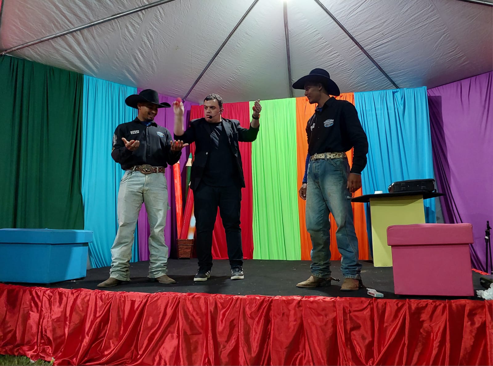 Até os peões do Rodeio entraram nas brincadeiras divertidas e curiosas do Mágico Gabriel, cujo ilusionismo impressionou a plateia