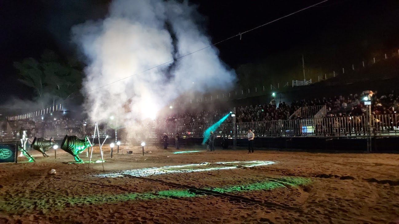 Arquibancada cheia, público atento e fumaça cenográfica na pista anunciando o começo de mais uma apresentação do Rodeio