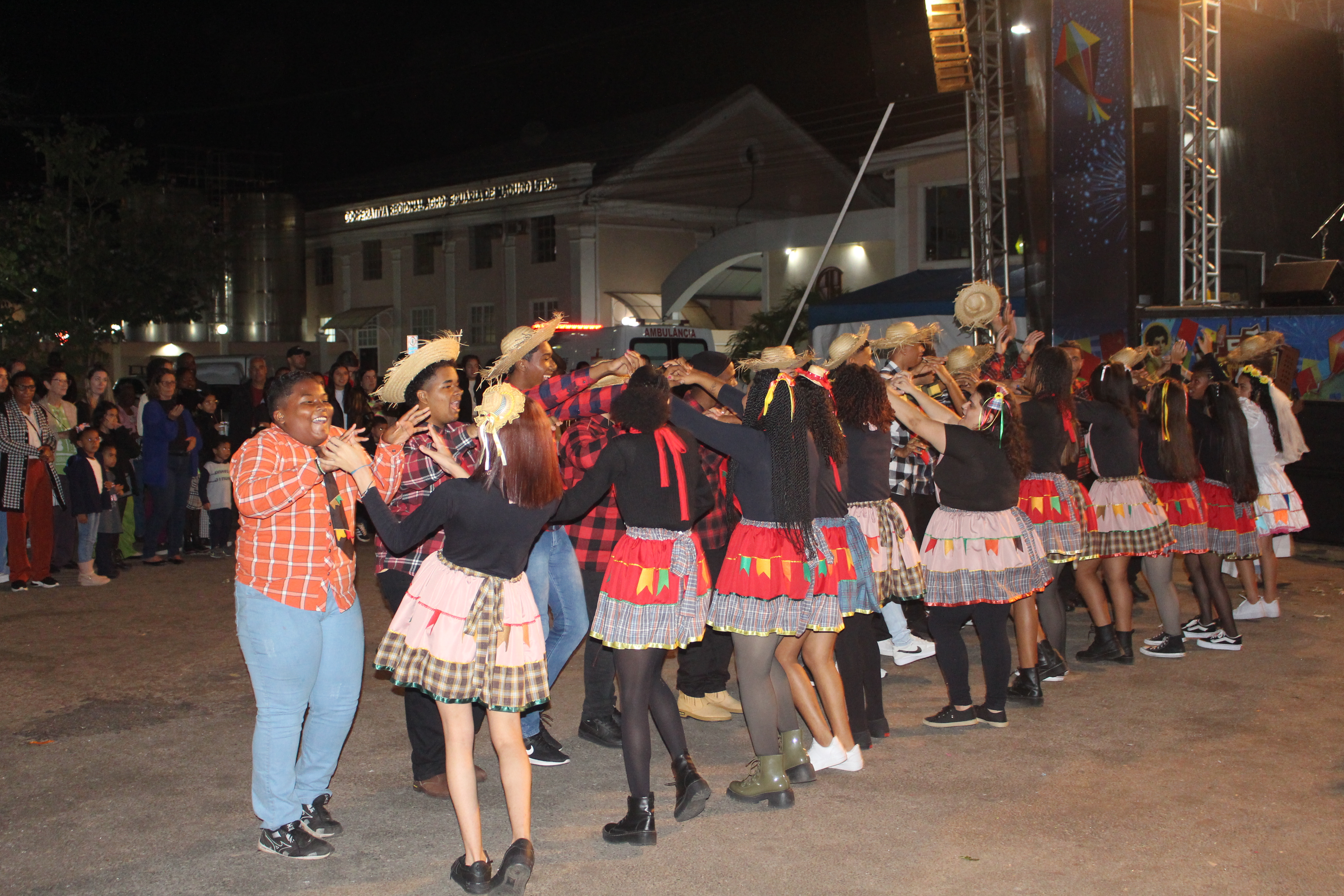 Diante do palco principal, Quadrilha de São João Batista faz a sua apresentação para o público presente