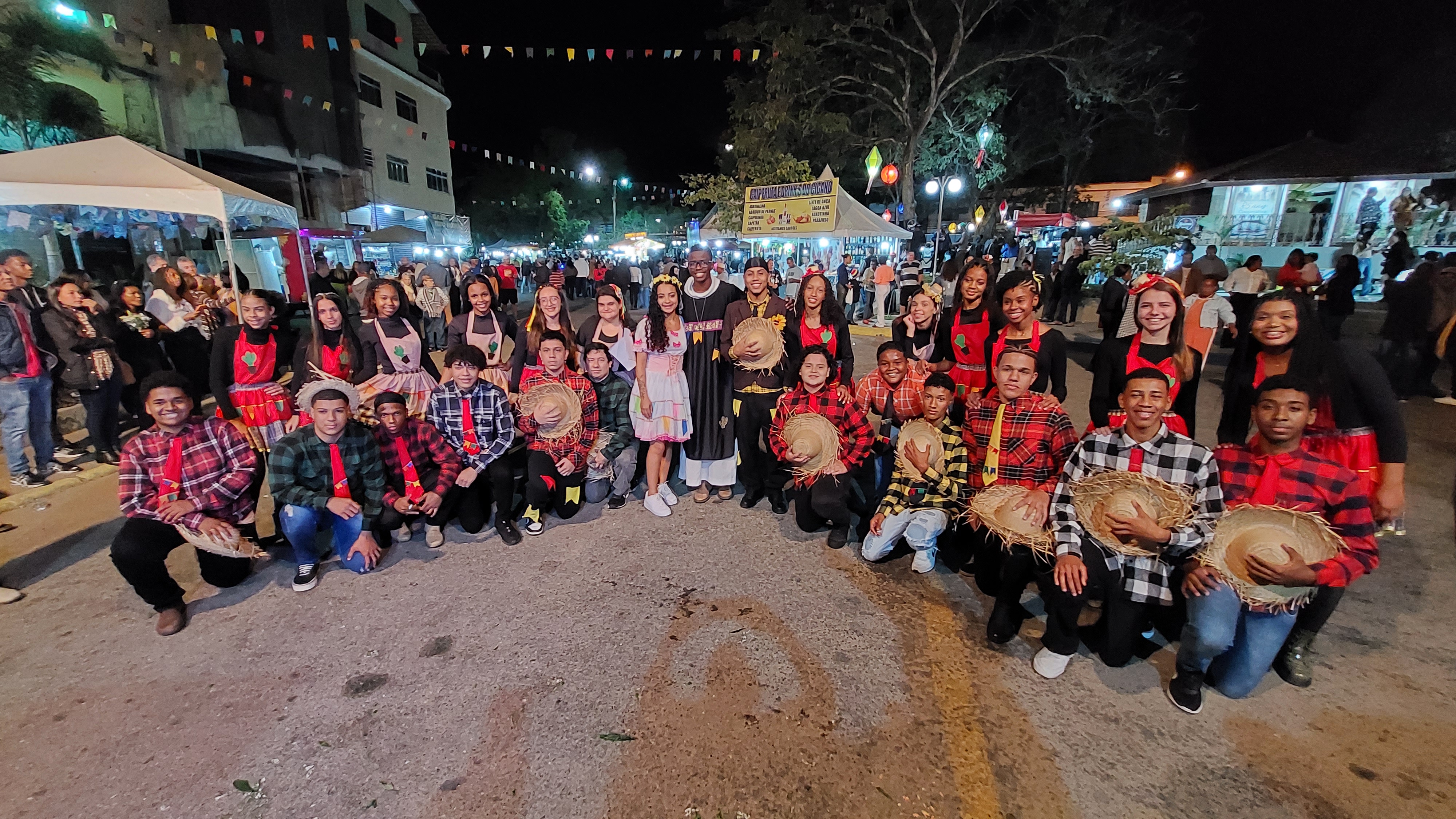 Felizes e satisfeitos com o resultado da apresentação, moças e rapazes da Quadrilha de São João Batista posam para fotografia