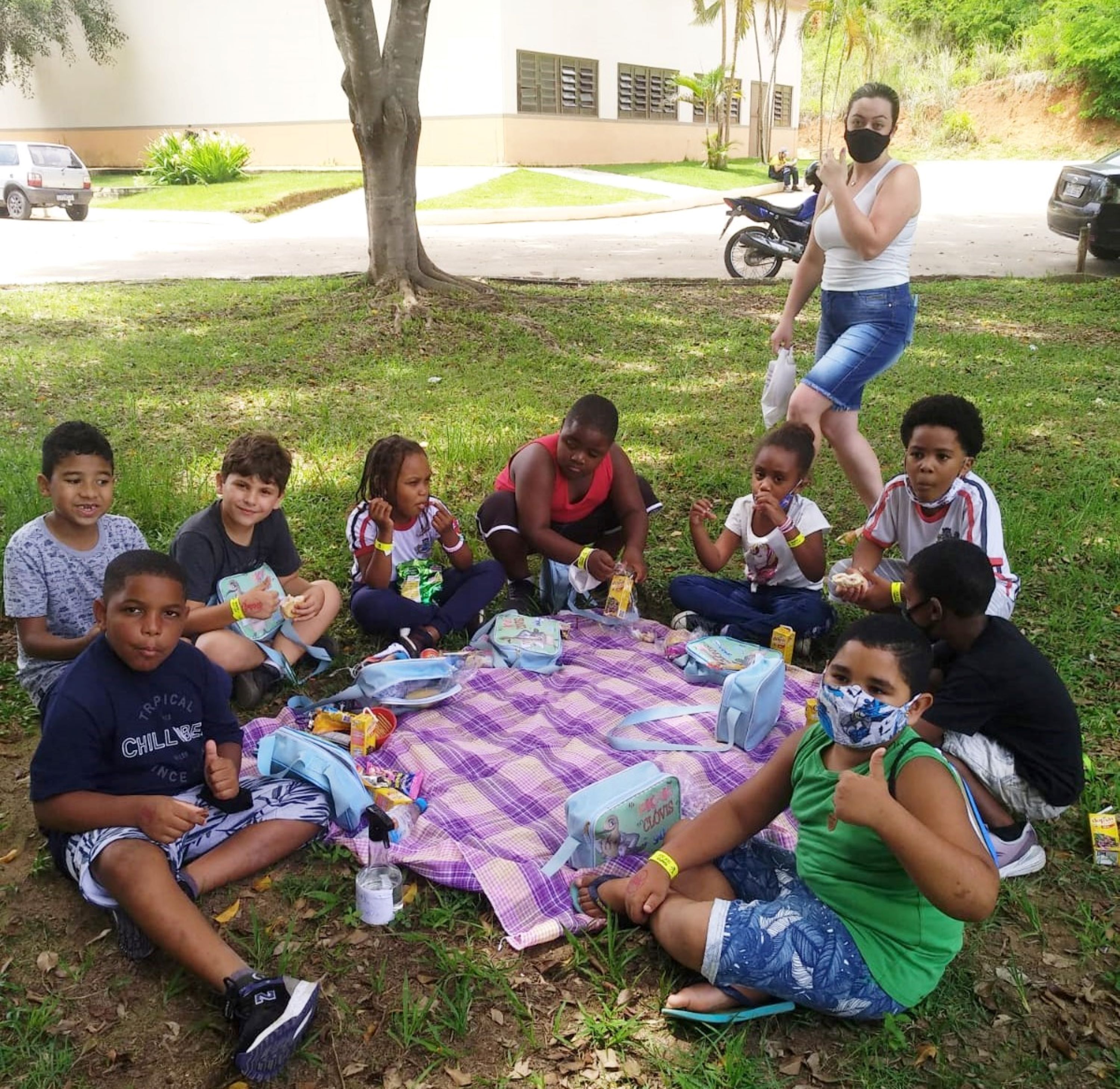 Na hora do piquenique propriamente dito, meninas e meninos se uniram para degustar seus lanches