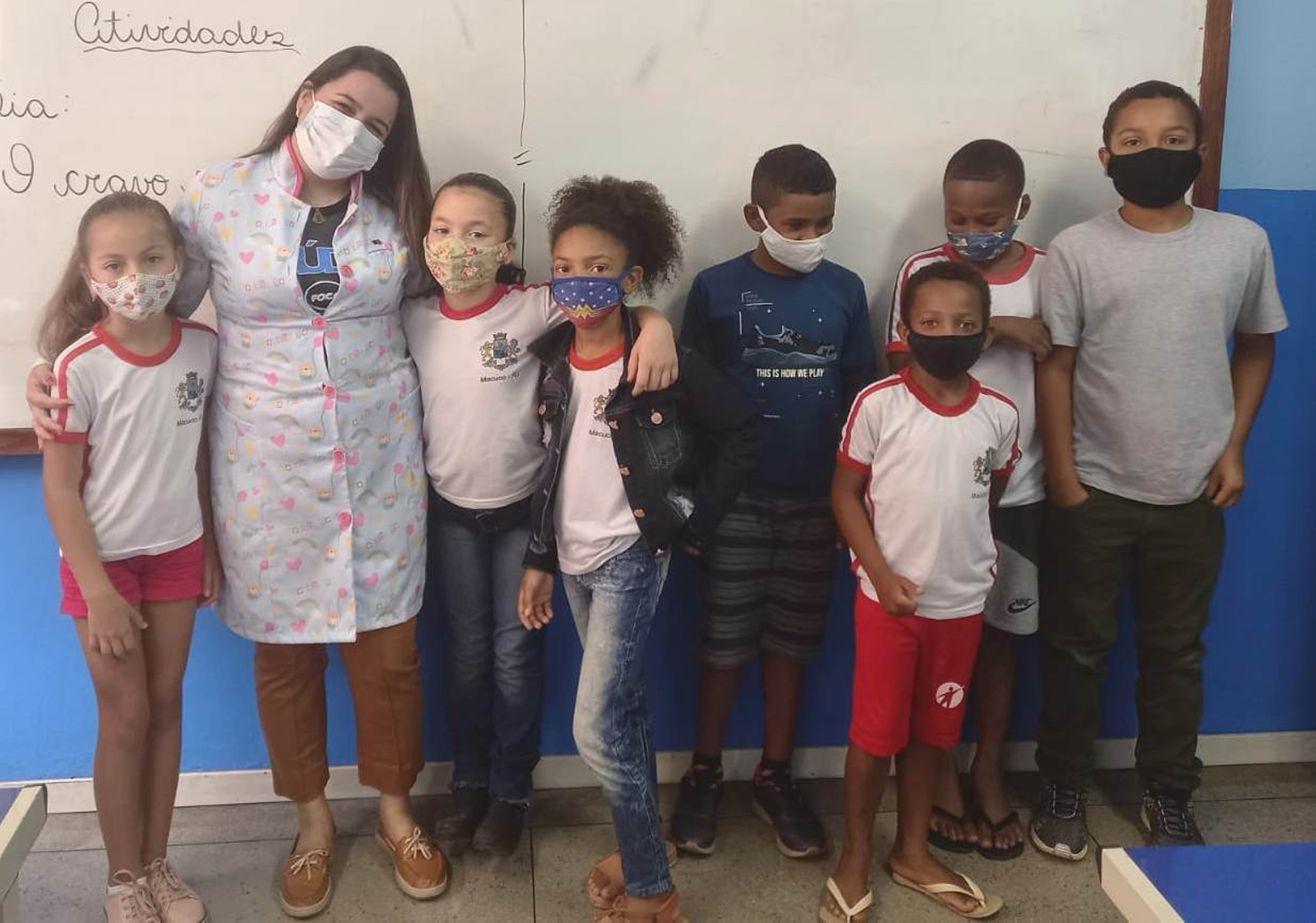 Dentista responsável pelo programa e professora com os estudantes durante a visitação feita à Escola David Coelho dos Santos