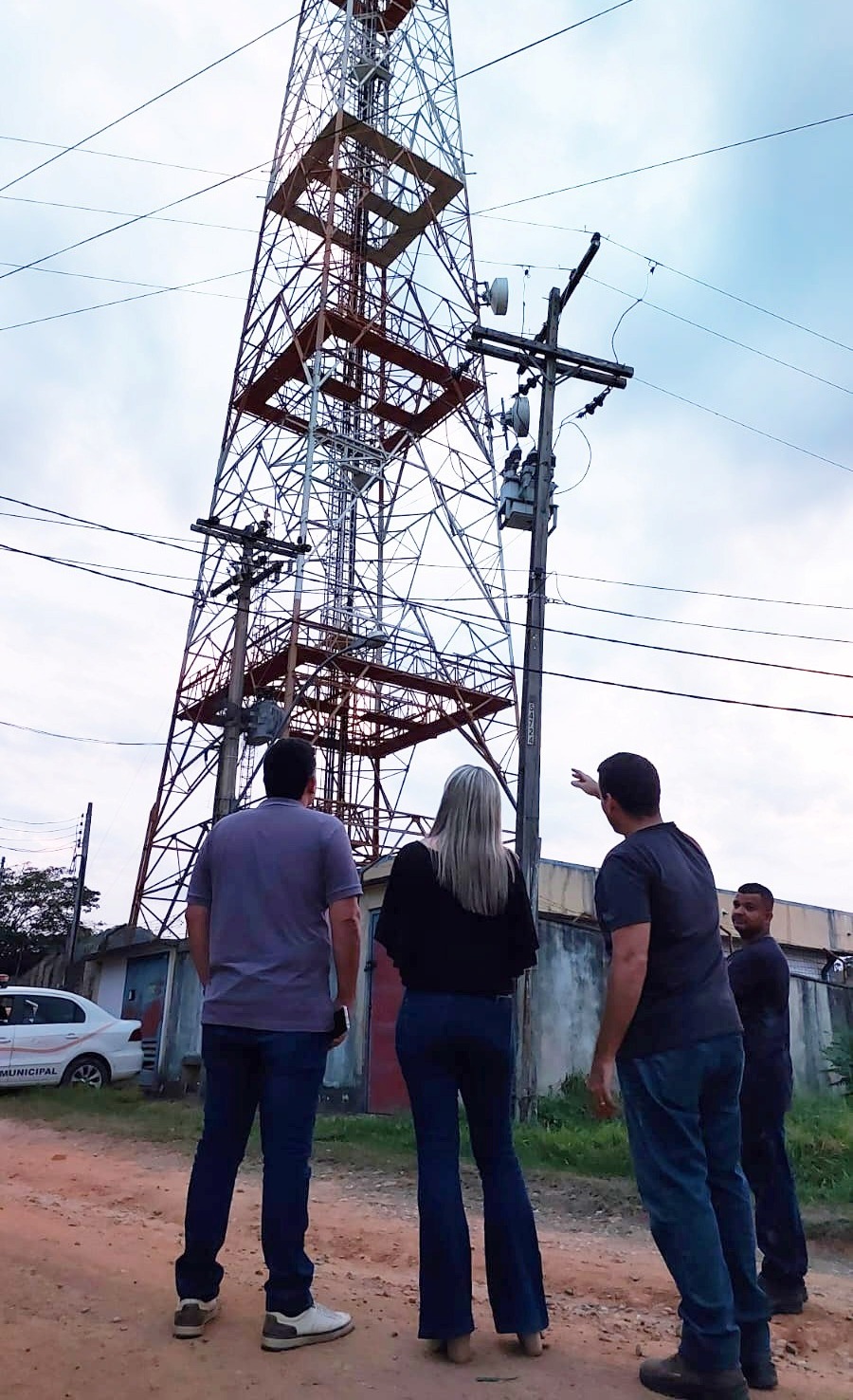 Um dos técnicos faz as explanações para a prefeita Michelle Bianchini e o secretário de Governo João Vitor no local da instalação da antena