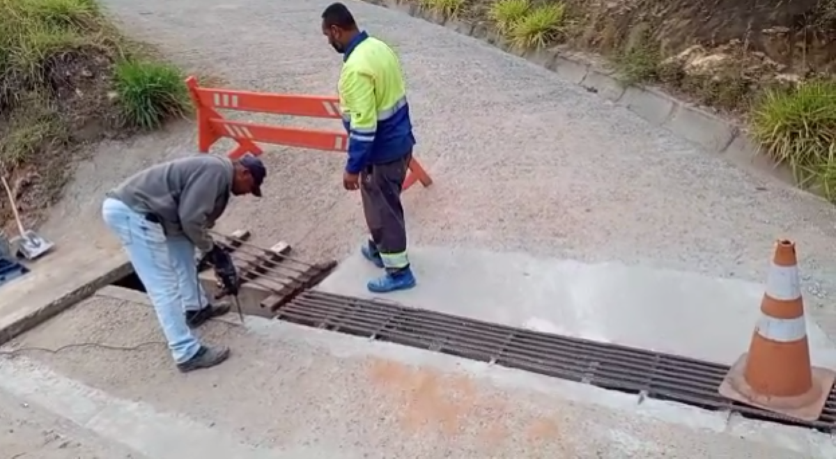 Recolocação, na subida do Araponga, da grade sobre um ponto de escoamento das águas pluviais