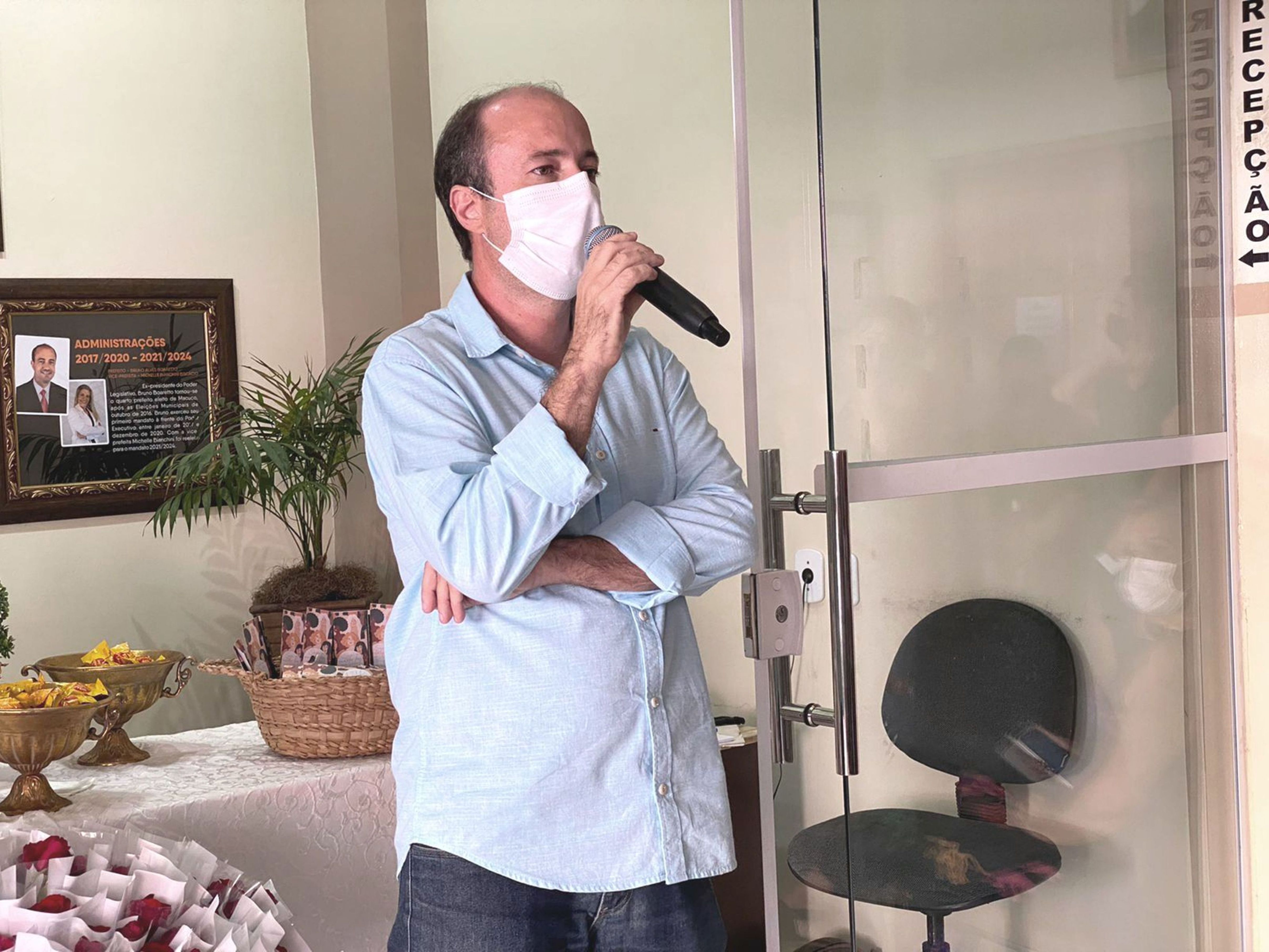 Prefeito Bruno Boaretto discursa no saguão de entrada da Prefeitura de Macuco durante a solenidade simbólica