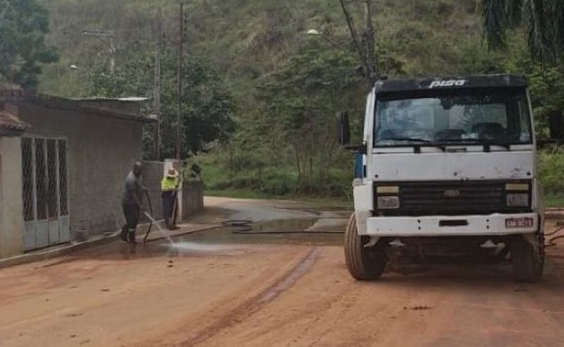 Com auxílio do caminhão pipa, servidores da Secretaria de Obras realizam a lavagem das ruas, uma delas no bairro Volta do Umbigo