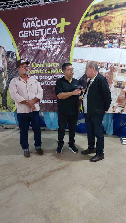 Registro da cobertura da Rádio 94 FM, com o secretário de Agricultura Paulo Sérgio e o presidente da Cooperativa Silvio Marini destaca o pioneirismo de Macuco na genética bovina