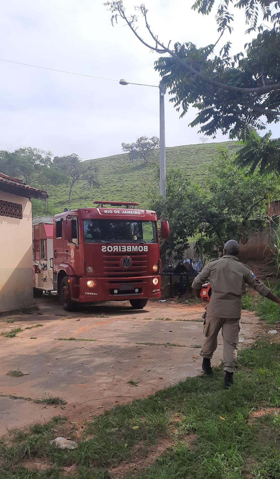 Caminhão do Corpo de Bombeiros chega ao CIEP Honório Peçanha para controlar o pequeno incêndio num bambuzal