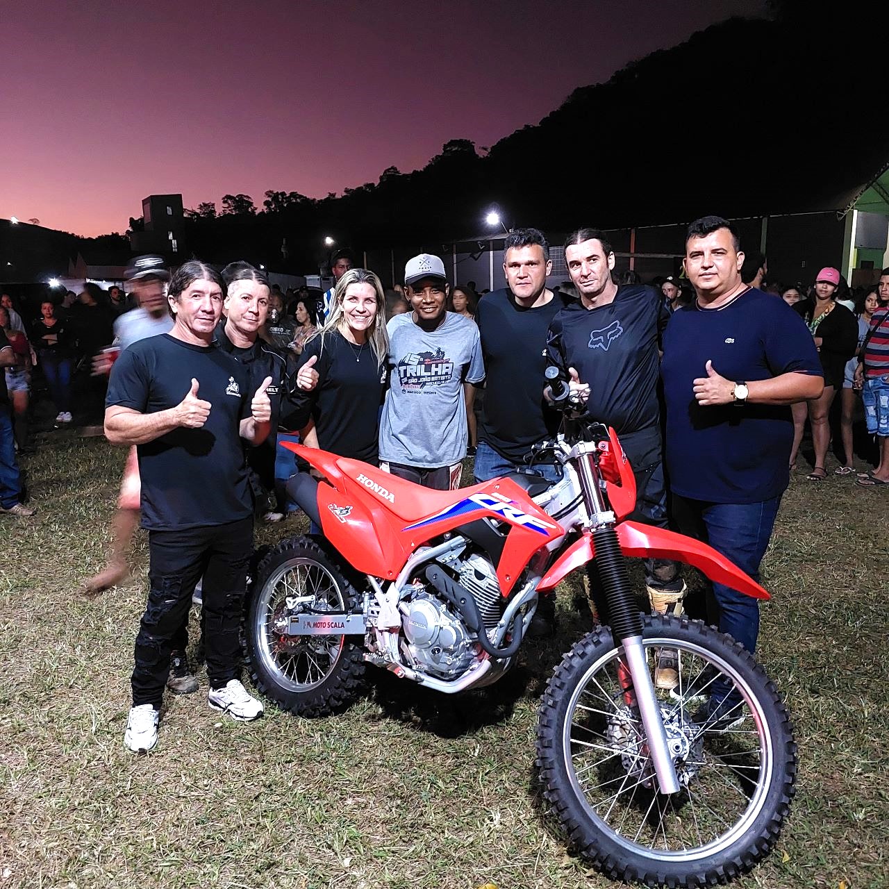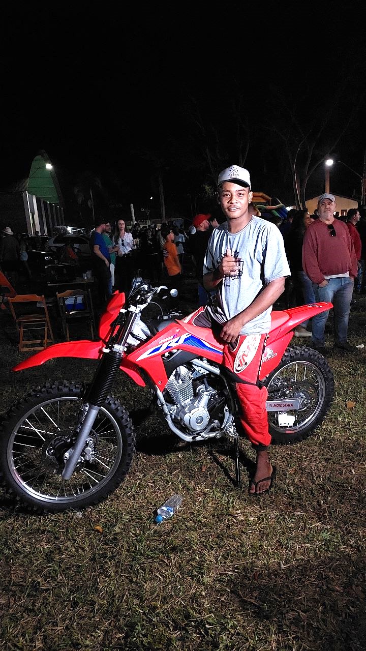 Feliz da vida pela conquista obtida no sorteio, o sortudo Franciel Rosa Benedito comemora o fato de sair da trilha com a moto zero quilômetro