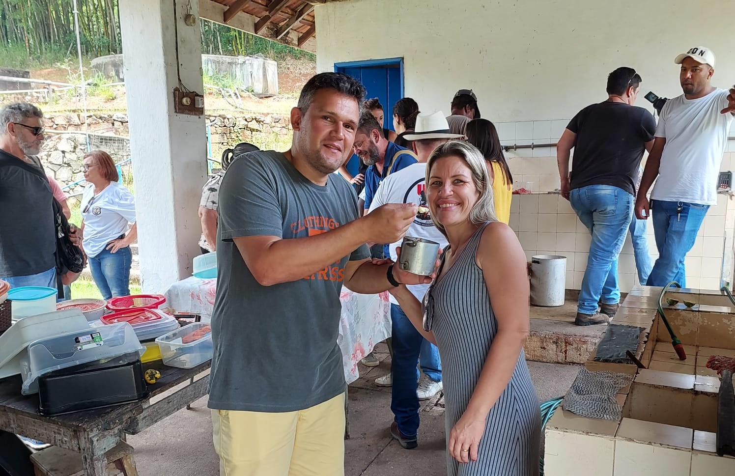 Com o diretor de Cultura Carlos Fonseca, a prefeita Michelle Bianchini prova um pouco da raspa da goiabada artesanal no próprio tacho em que foi feita