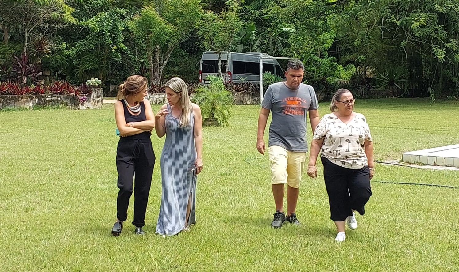 Michelle Bianchini conversa com Raquel Stumm caminhando ao lado do secretário de Governo João Vitor e da diretora de Turismo Naná Boquimpani
