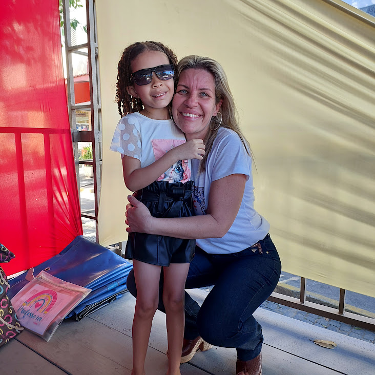 Prefeita Michelle Bianchini externando seu carinho à pequena artista durante o Show de Talentos da FLIMAC/2023