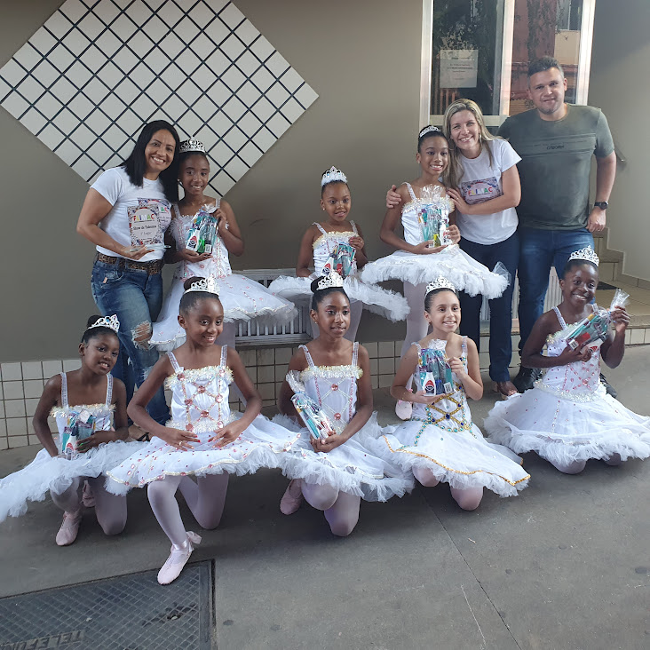 Após o sucesso da apresentação no Show de Talentos, professora e bailarinas posam para a foto com Michelle Bianchini e João Vitor Pontes