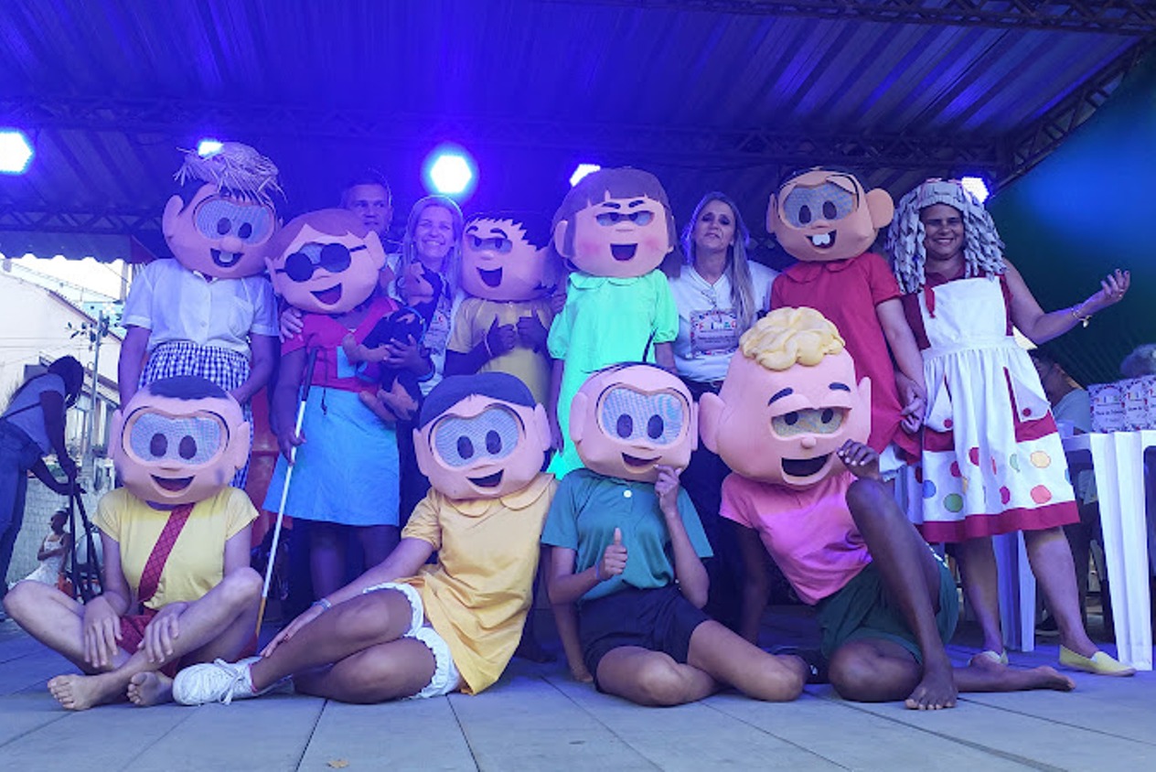 Bonecos encarnando os personagens de Maurício de Sousa junto com a prefeita Michelle Bianchini e os secretários João Vitor Pontes e Claudia Vogas
