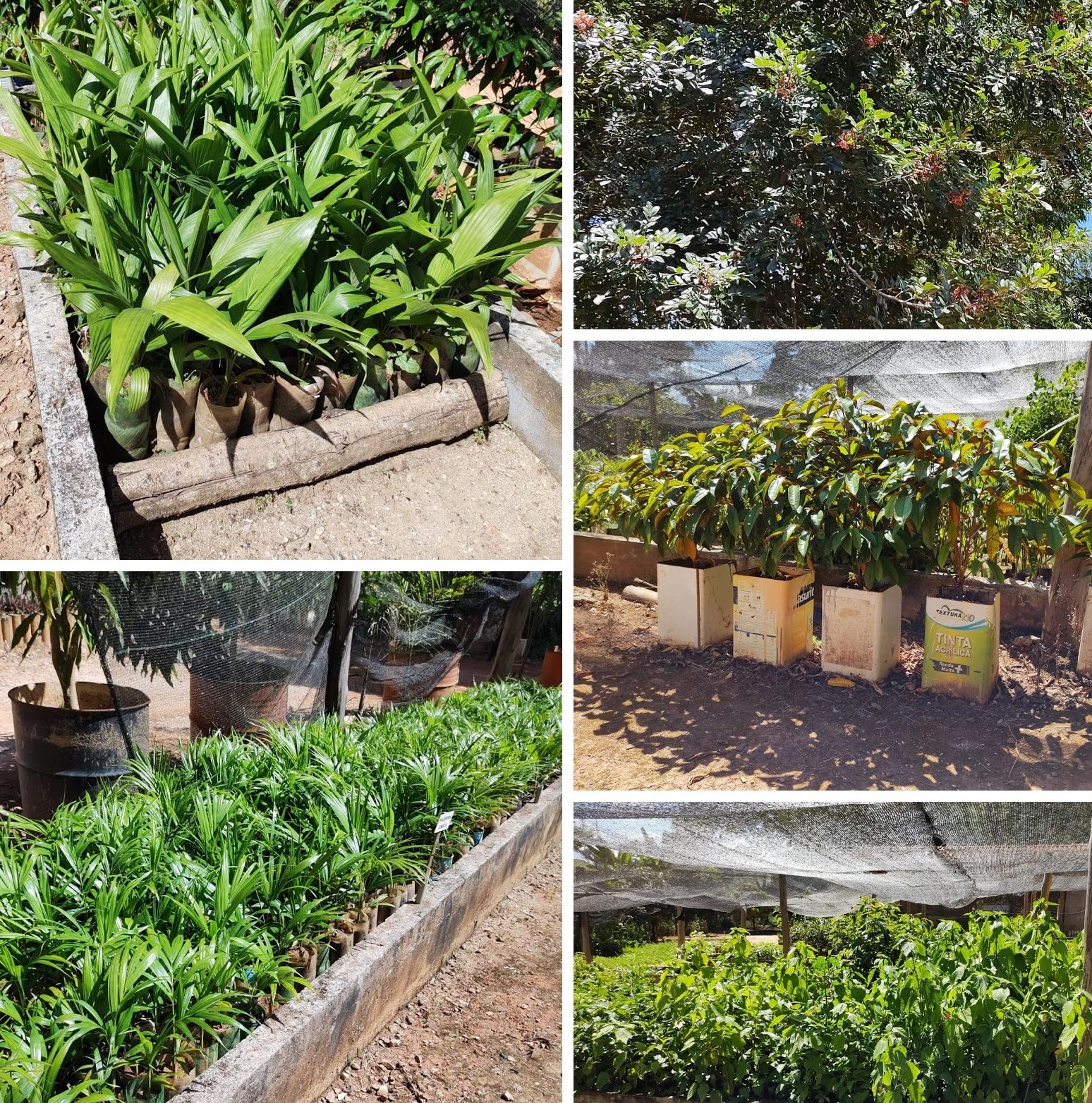 Da esquerda para a direita estão as espécies Algodão da Praia, Graviola, Canito Verde, Palmeira Veitchia, Abiu Amarelo, Mexerica