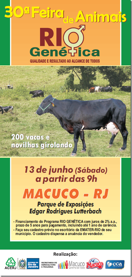 Roney Louvain e Luiz Altamiro Nogueira, coordenadores Operacional e Técnico do Programa Rio Genética, confirmaram que o evento será realizado no dia 13 de junho, um sábado, a partir das 9 da manhã, no Parque de Exposições Edgar Lutterbach, com a oferta de aproximadamente 200 animais, entre vacas e novilhas da raça Girolanda.
