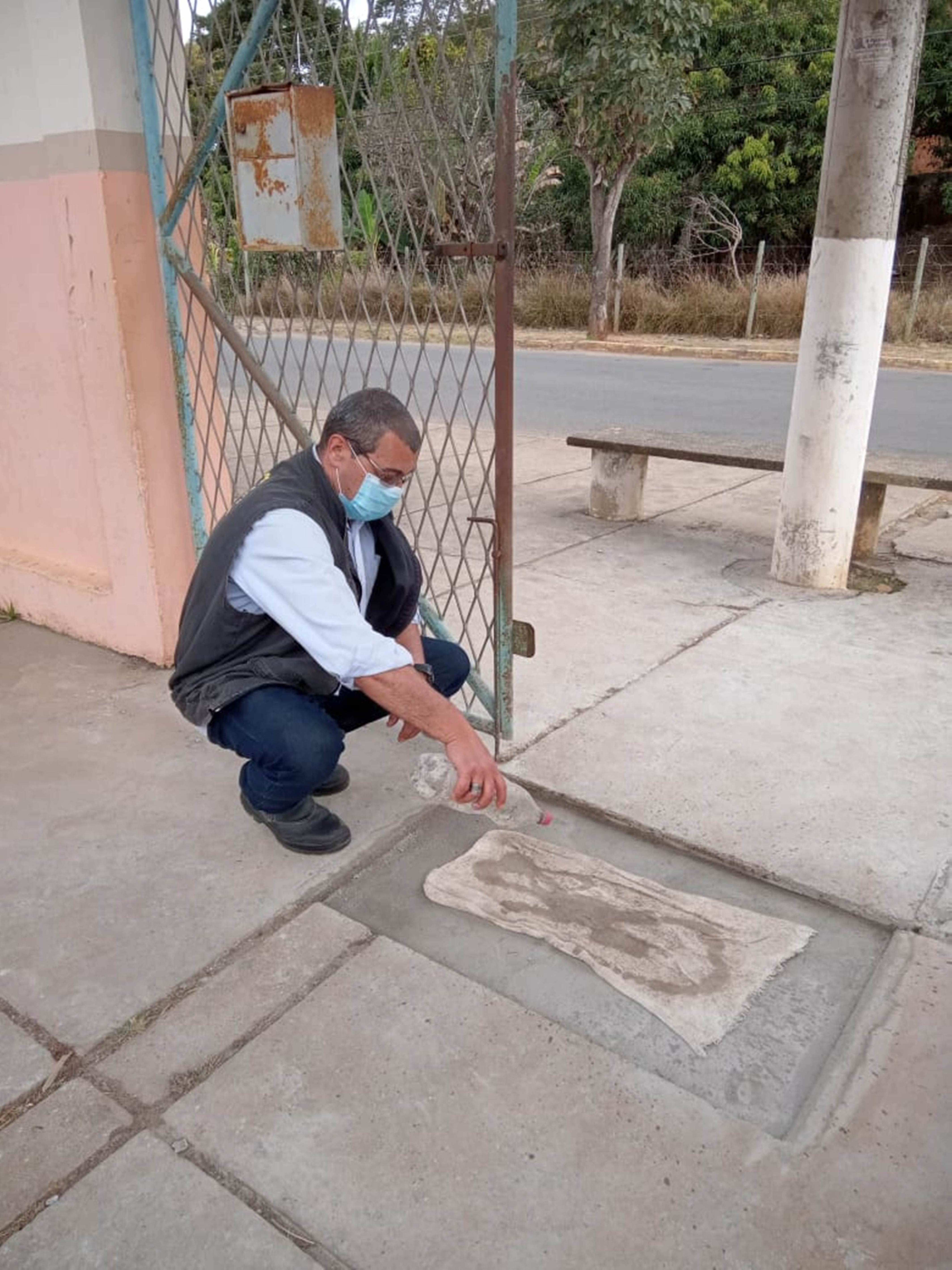 O próprio coordenador dispõe material sanitizante no portão de uma escola