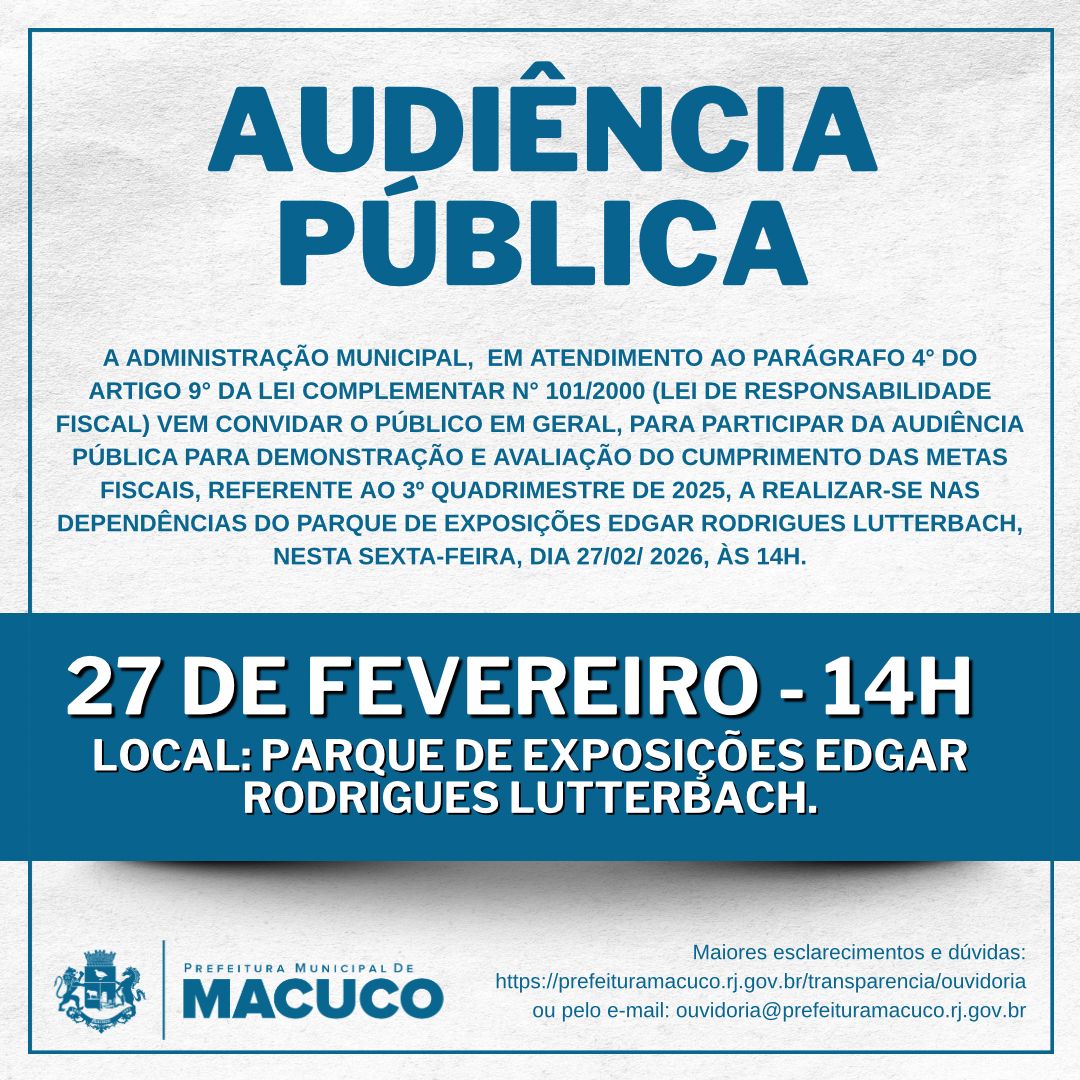 A transparência e a responsabilidade fiscal voltaram a ser protagonistas na Gestão Municipal de Macuco durante a Audiência Pública de Prestação de Contas do Terceiro Quadrimestre de 2025, realizada na tarde desta sexta-feira, 27 de fevereiro, no Auditório Francisco Dornelles, no Complexo do Macuco Rural Park. Cumprindo as determinações da Lei de Responsabilidade Fiscal (Lei Complementar 101/2000), o encontro apresentou de forma clara e acessível os números da execução orçamentária, garantindo à população o direito de acompanhar como os recursos públicos vêm sendo aplicados.