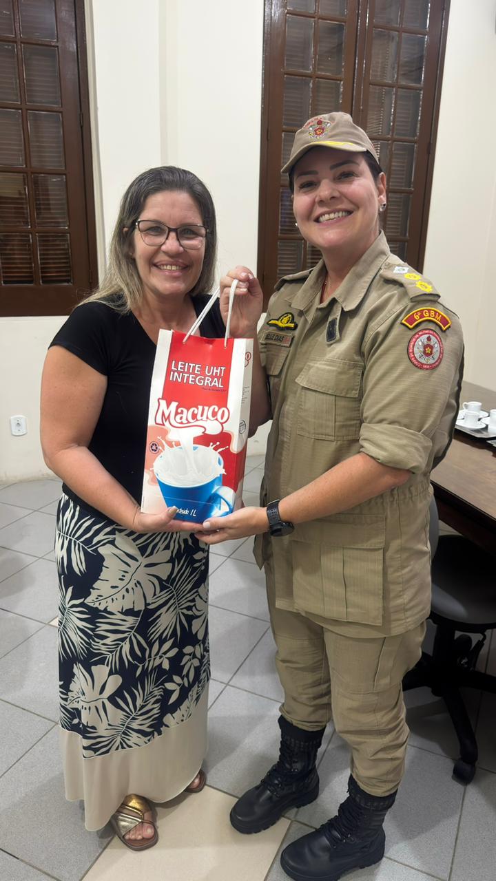 Em contrapartida, a prefeita retribuiu o carinho e atenção da Tenente-Coronel Michelle Dias entregando os tradicionais produtos da Cooperativa de Macuco