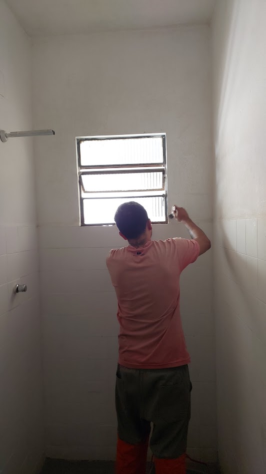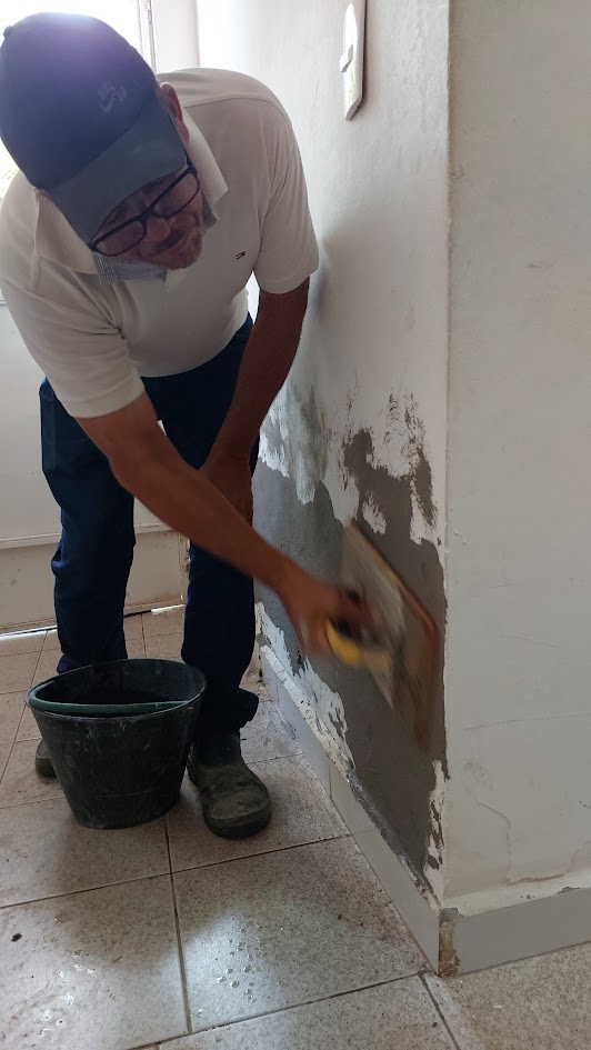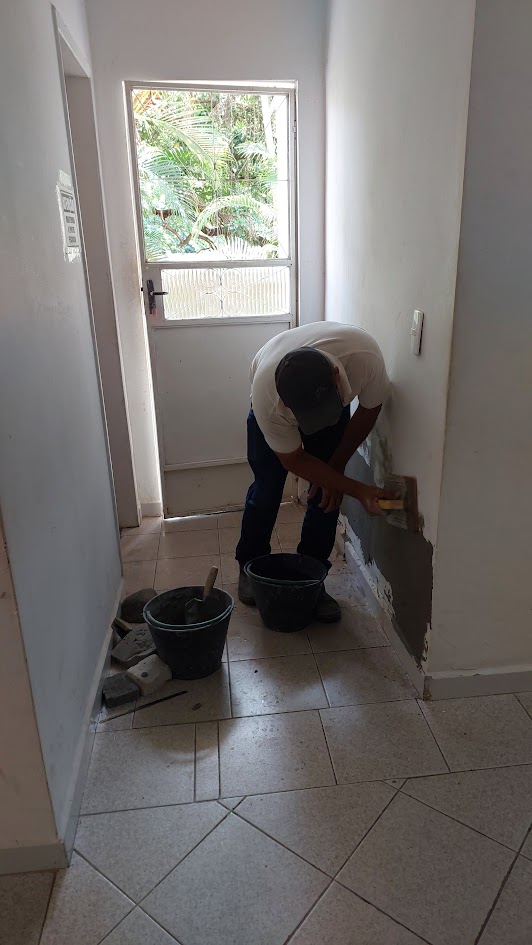 Outro servidor municipal atuando na área interna e já colocando o novo reboco onde era necessária a realização desse reparo