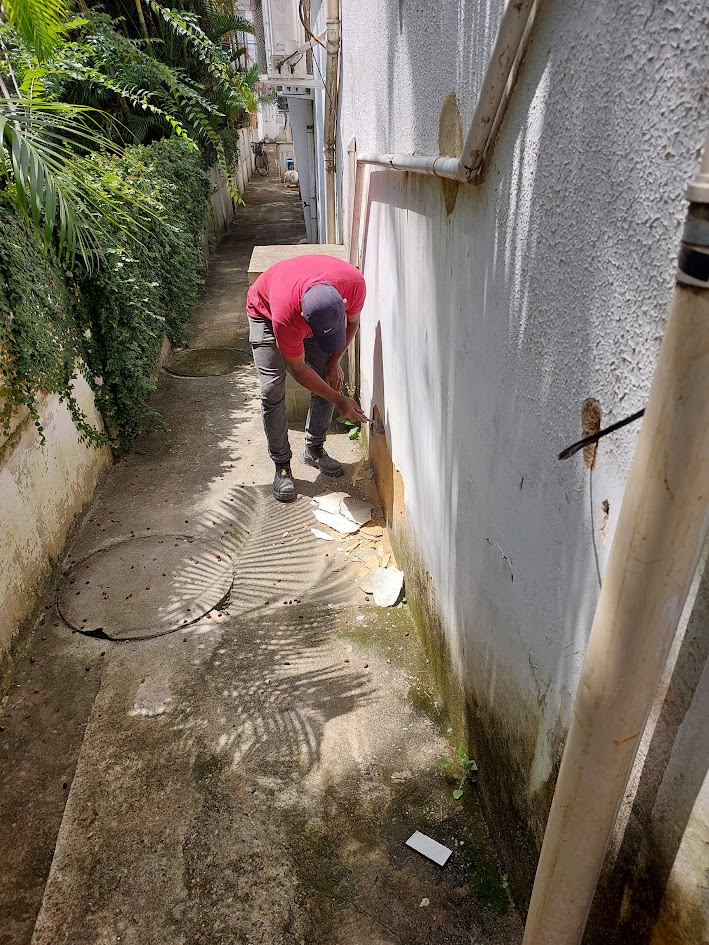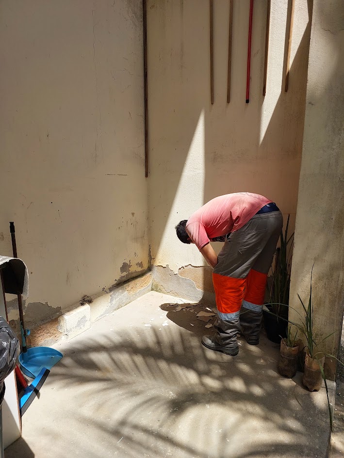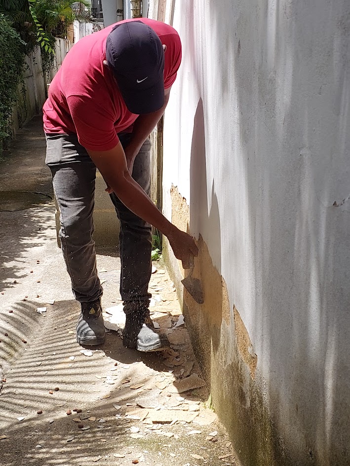 Profissional retirando pedaços do reboco numa área externa do Centro de Saúde visando melhorar na sequência a qualidade da parede do lado de fora da unidade