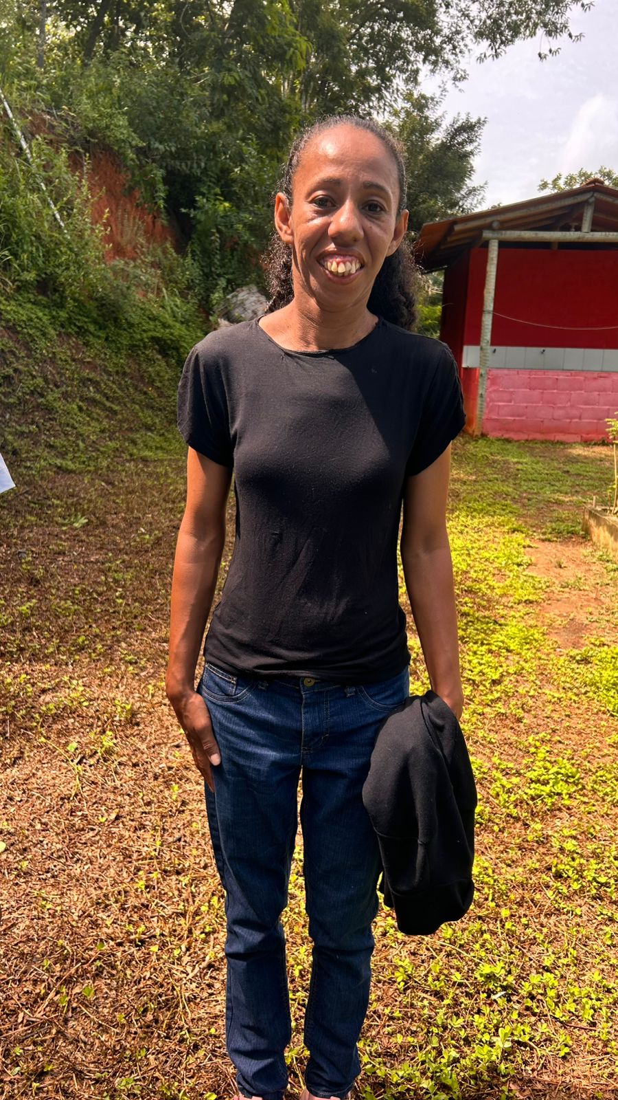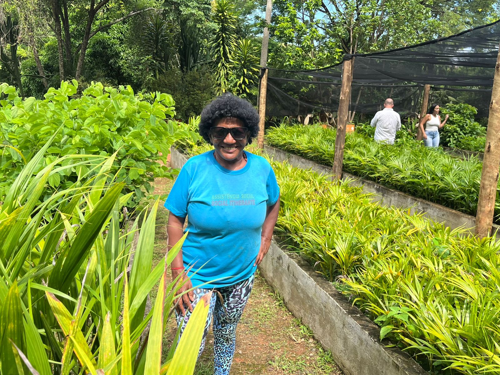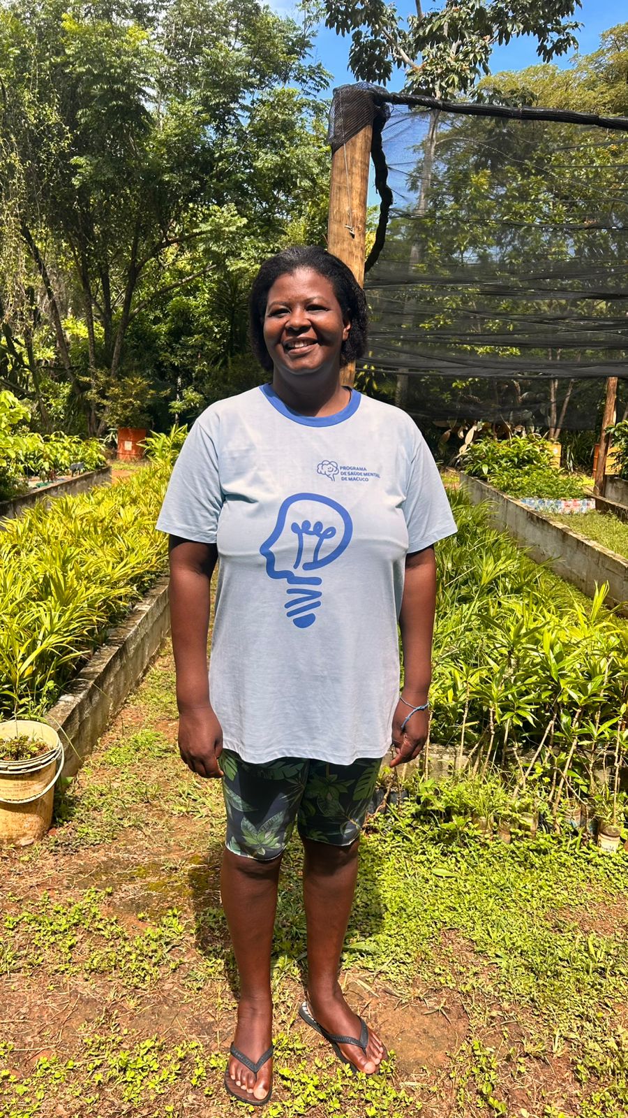 Mais uma das participantes posando para uma foto no horto, símbolo de renovação, cuidado e da alegria proporcionada pelas atividades ao ar livre