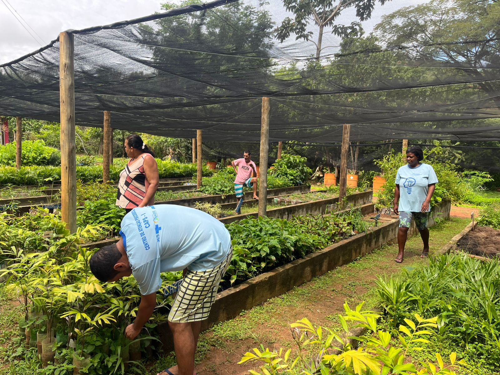 Caminhando pelos viveiros do horto, os participantes do CAPS exploraram novas experiências e desfrutaram de um ambiente tranquilo e acolhedor