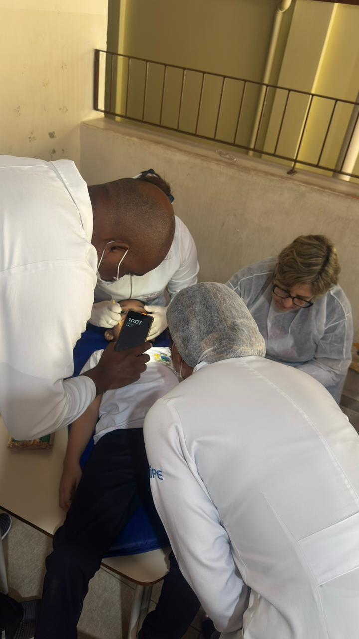 Profissionais de saúde unindo forças na escola para realizar avaliações detalhadas com técnicas modernas e olhar atento para um cuidado prático e imediato